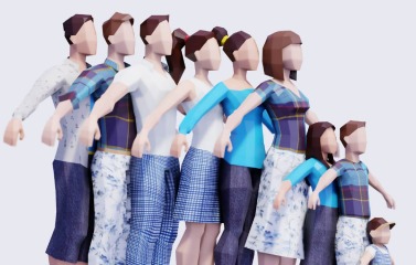 SKIN TEXTURES FOR VARIATION AND RANDOMNESS AVAILABLE AT THE STORE Change the clothes, skin tone, shoes, and hair as you please to give your render more variation and seamless repetition. We have developed a huge collection of textures that are great to create crowds with all our people. All our Low Poly People are compatible with our unique maps to make them all look different, just duplicate and change texture, getting a completely different character.