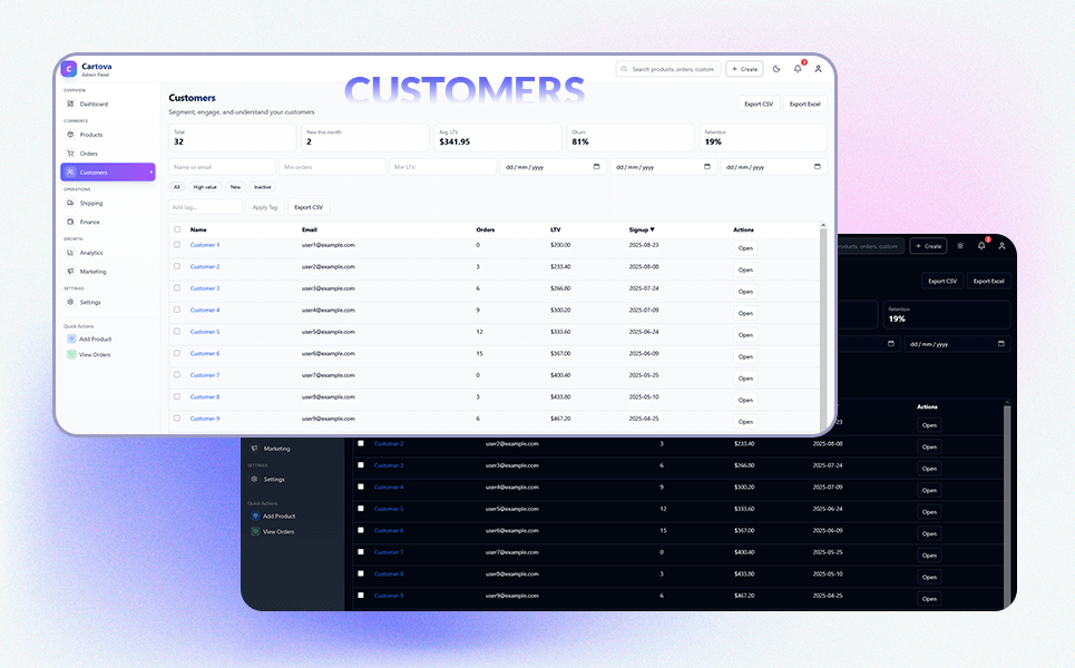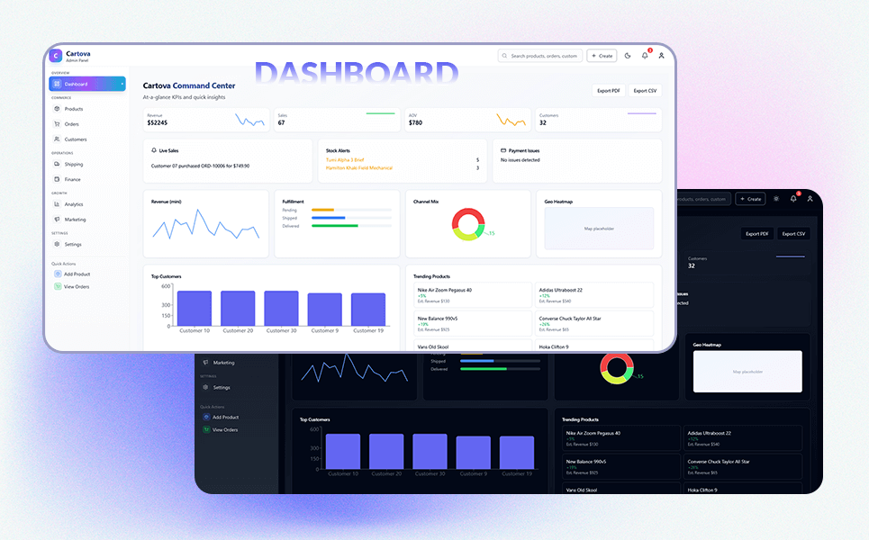 Whether you’re an individual developer, a startup, or a corporate team, Cartova equips you with the right set of features to create professional dashboards that blend functionality, flexibility, and modern design.