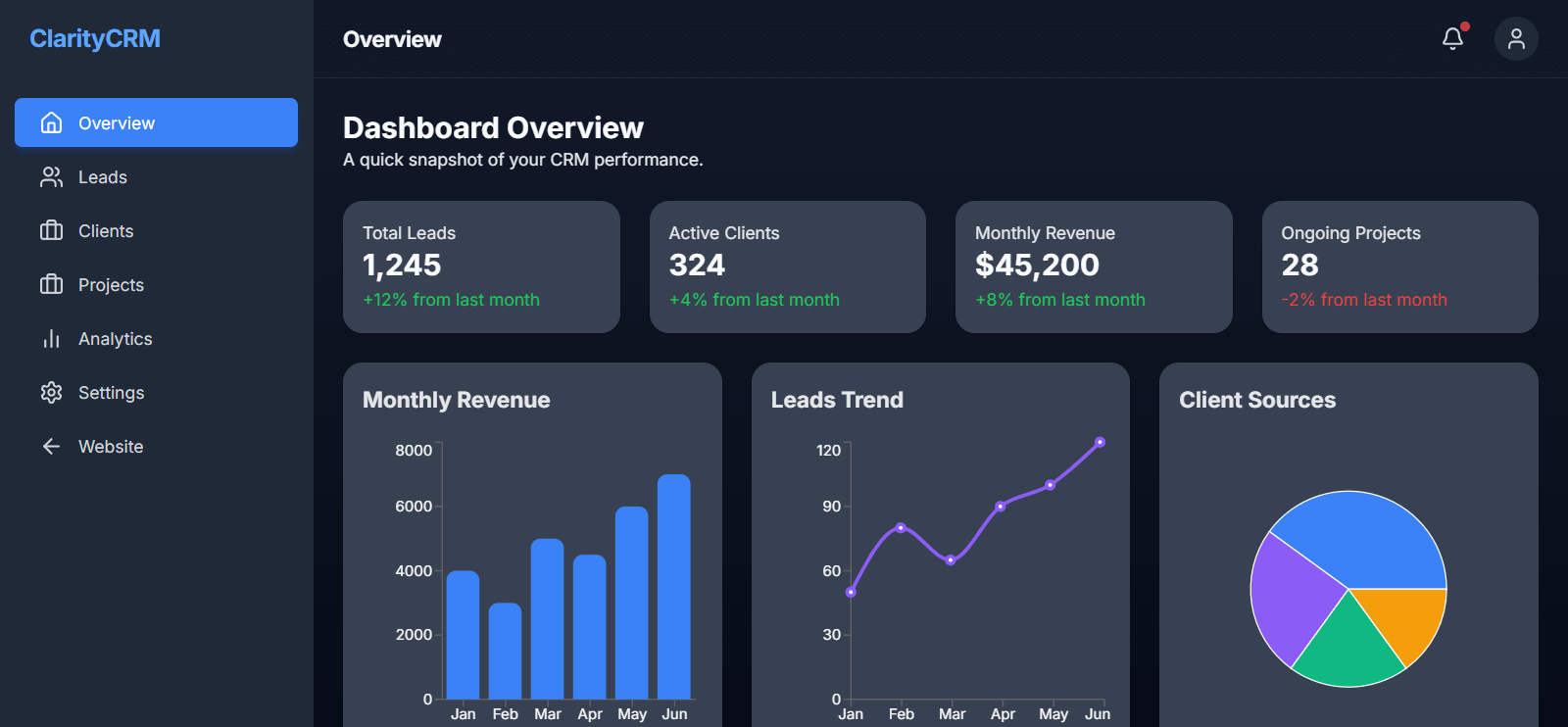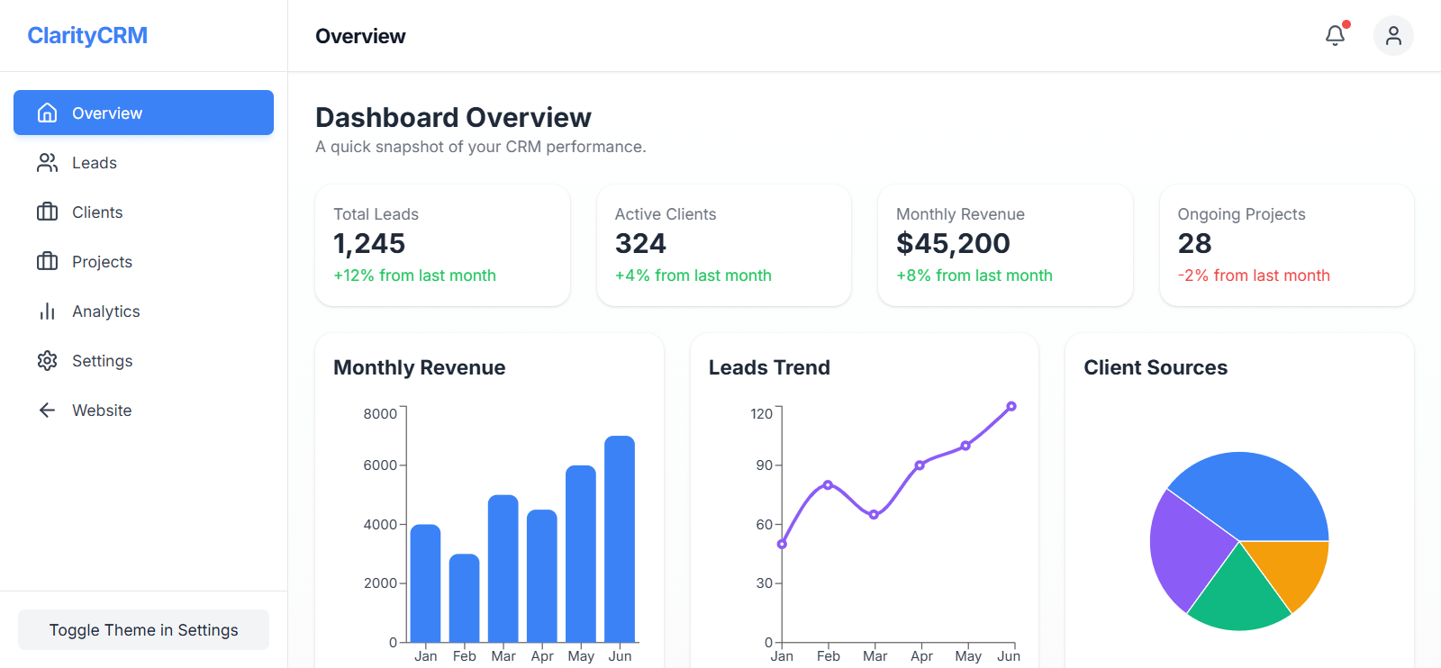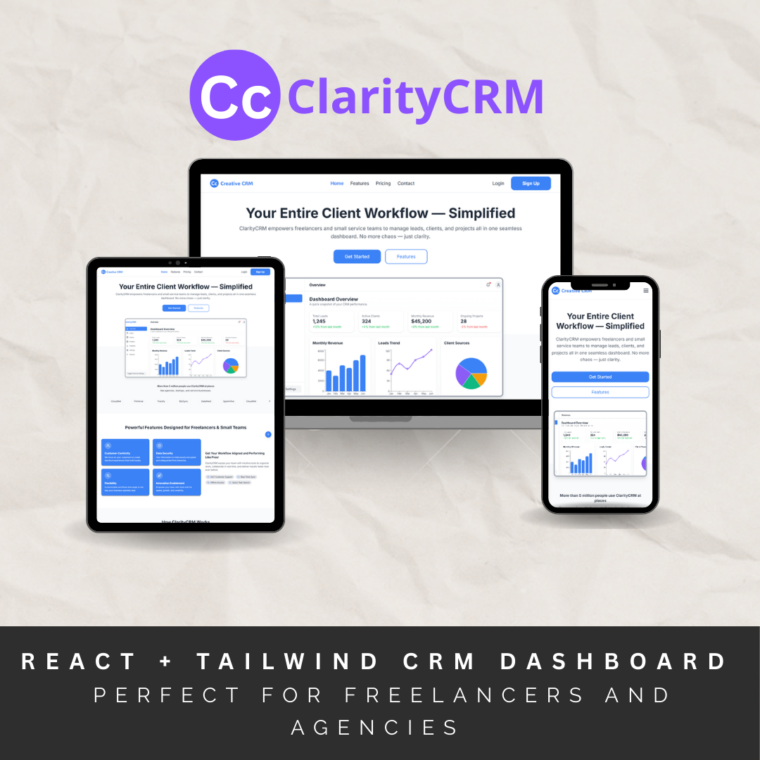 ClarityCRM is a premium React + Tailwind CSS dashboard template crafted for SaaS, CRM, and admin applications. With its sleek, modern design and fully responsive layout, it empowers freelancers, agencies, and startups to manage leads, clients, projects, and analytics with ease. Built with a clean architecture, reusable components, and scalable folder structure, ClarityCRM saves developers countless hours of setup and design work.