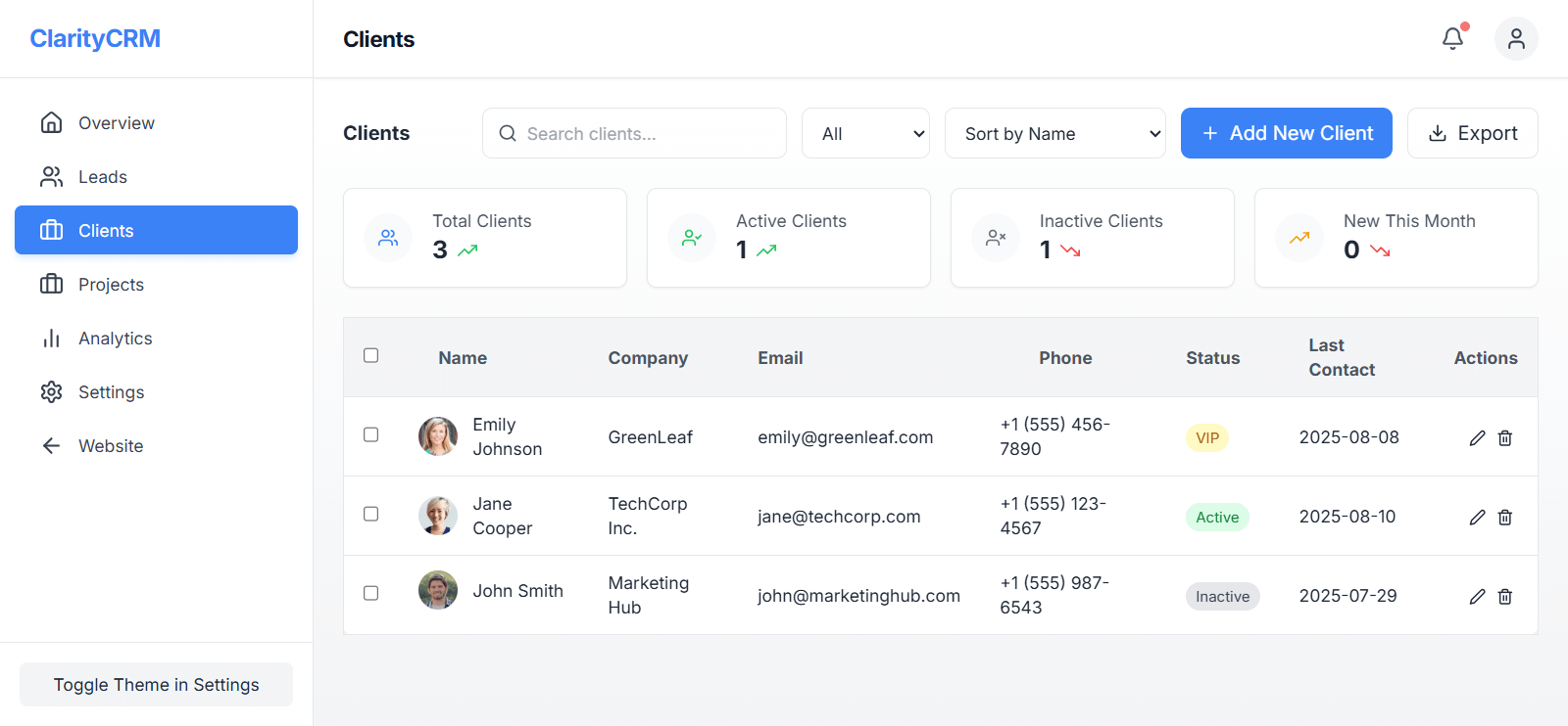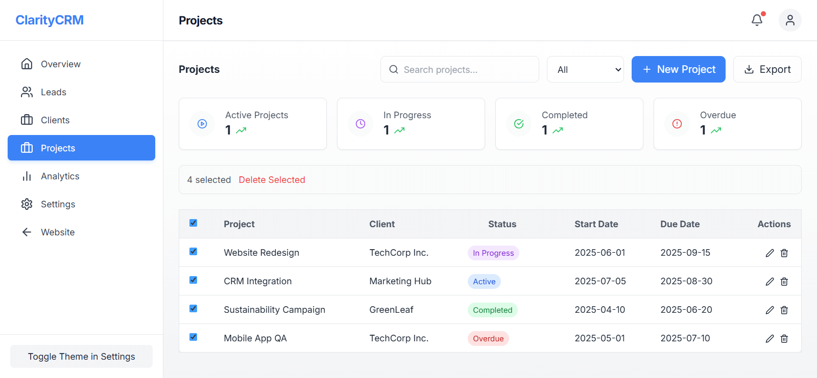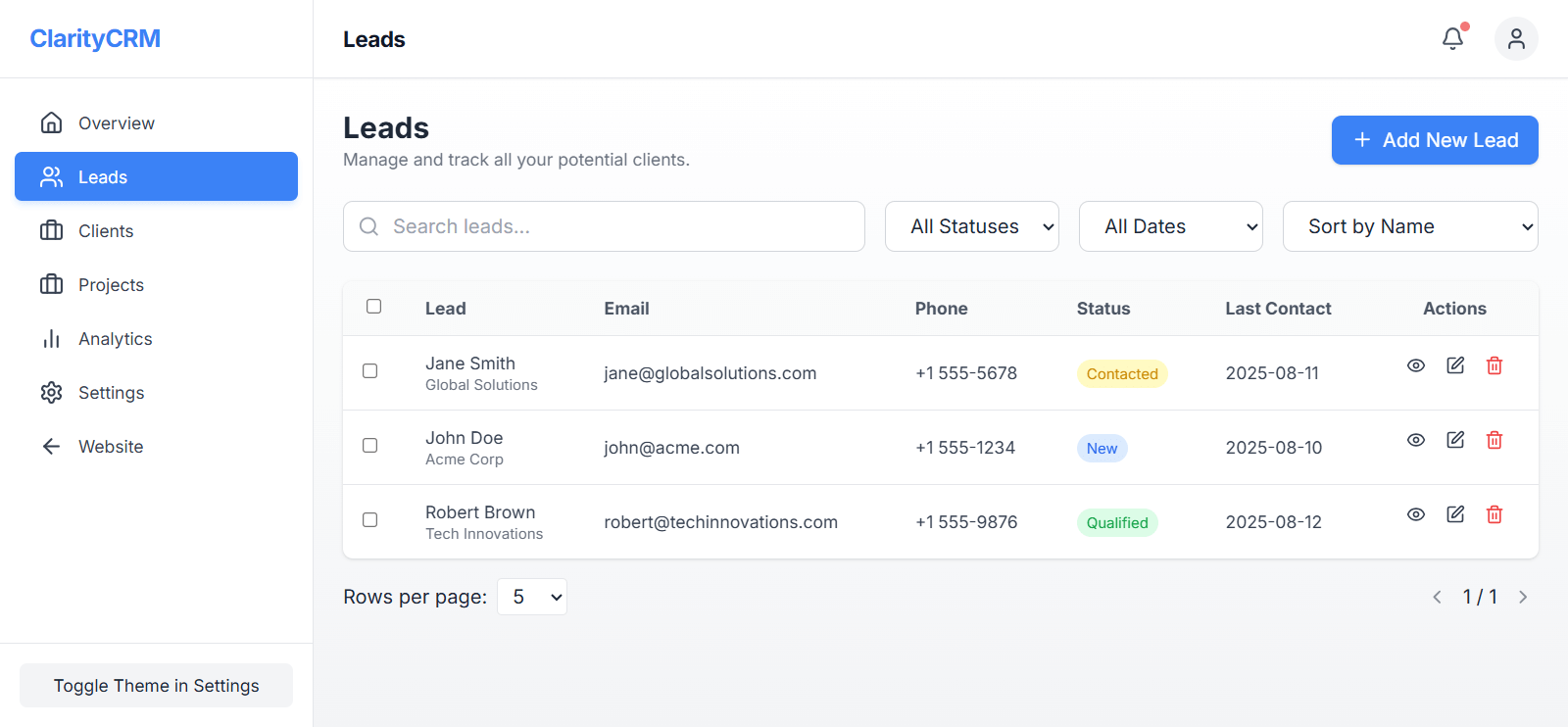 ClarityCRM is a premium React + Tailwind CSS dashboard template crafted for SaaS, CRM, and admin applications. With its sleek, modern design and fully responsive layout, it empowers freelancers, agencies, and startups to manage leads, clients, projects, and analytics with ease. Built with a clean architecture, reusable components, and scalable folder structure, ClarityCRM saves developers countless hours of setup and design work.