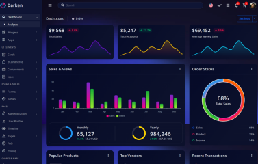 Darken admin is based on the Bootstrap 5 framework. It is a powerful and developer-friendly admin template. It is based on Sass. It includes colorful, light and dark dashboards. It has a huge collection of UI components with the latest jQuery bootstrap plugins. It is fully responsive and works with all major web browsers, desktops and smartphones. It is suitable for creating all types of web applications such as custom admin dashboards, eCommerce web applications, CMS or CRM web applications.