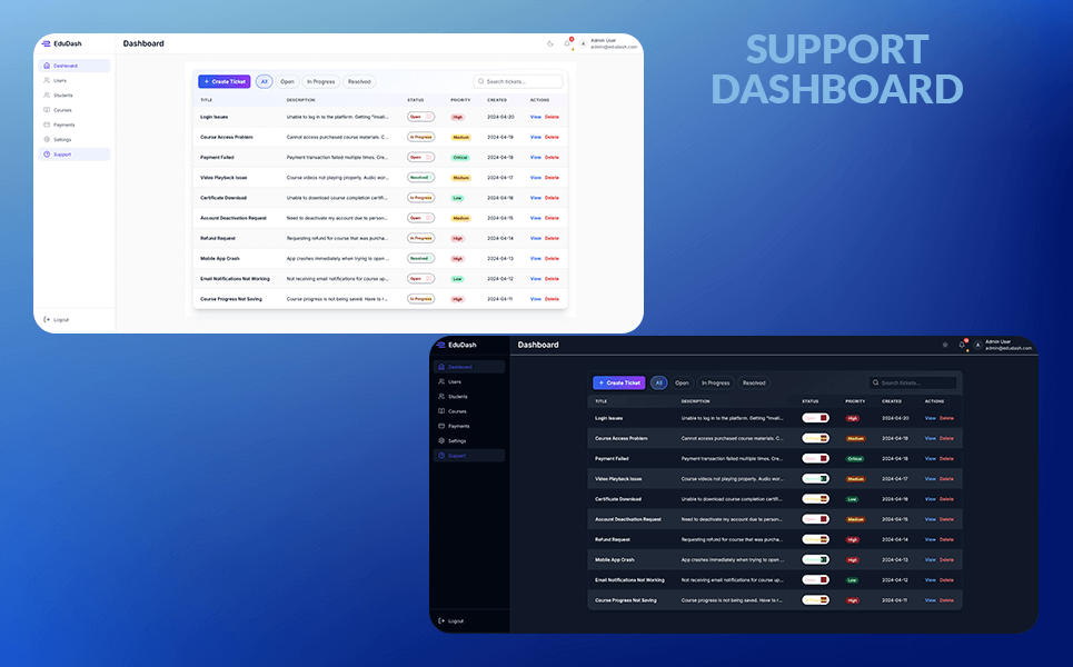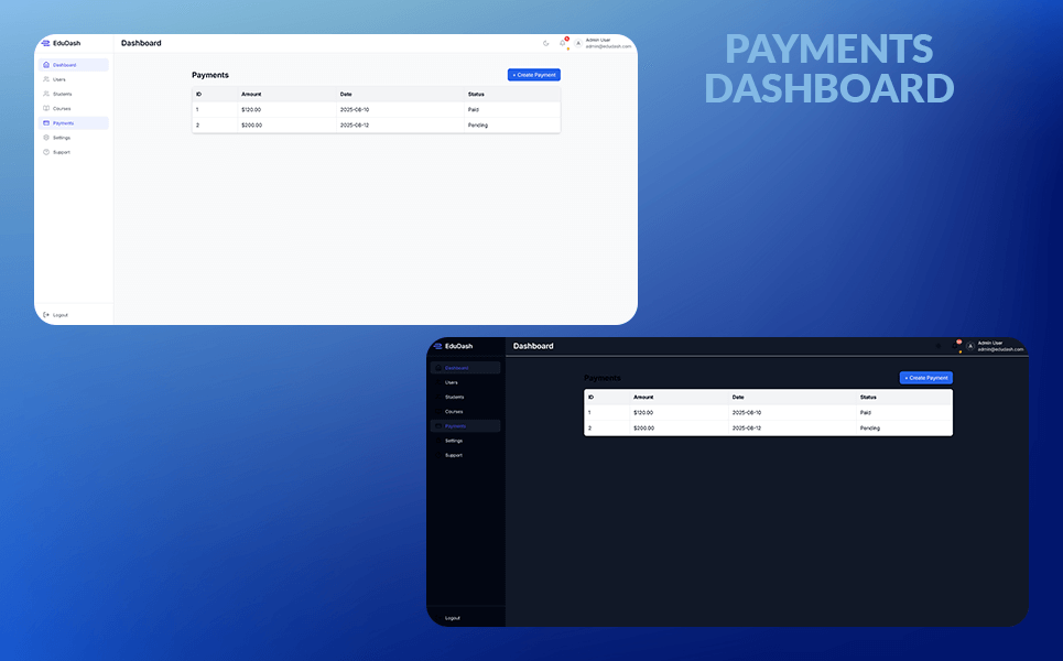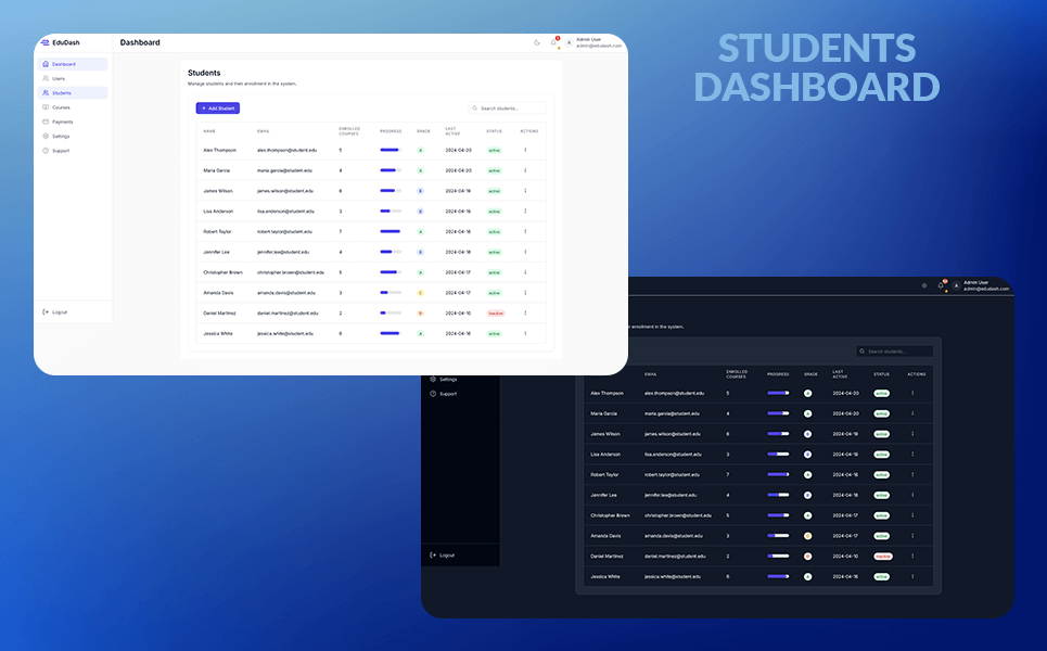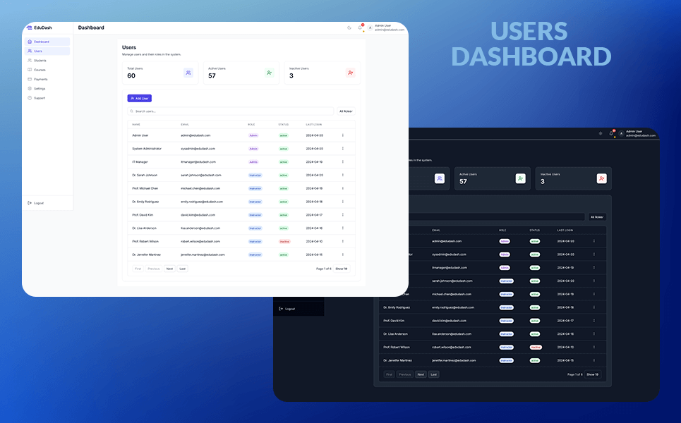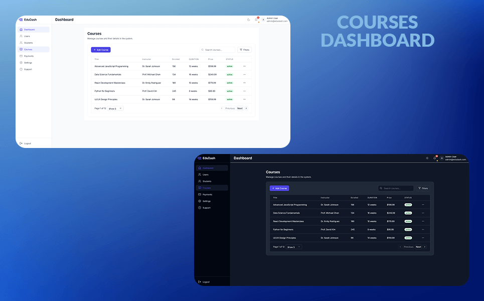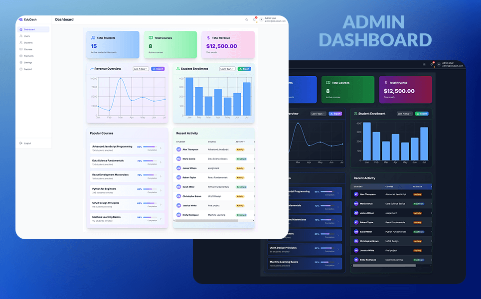 EduDash streamlines administrative workflows and enhances productivity while maintaining a professional and visually appealing design. Its modern interface and powerful features make it the ideal solution for educational management systems. Whether you are managing enrollments, course content, instructors, or payments, EduDash offers a complete, easy-to-use solution for educational institutions of all sizes.