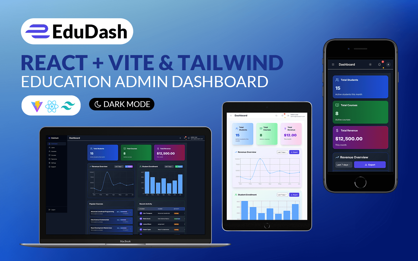 EduDash is a modern, fully responsive admin dashboard template designed for educational institutions, e-learning platforms, and training centers. Built with React, Vite, and TailwindCSS, EduDash provides a sleek and intuitive interface that helps administrators, teachers, and staff efficiently manage students, courses, instructors, and payments. Its modular design ensures flexibility, allowing for easy customization and scalability.