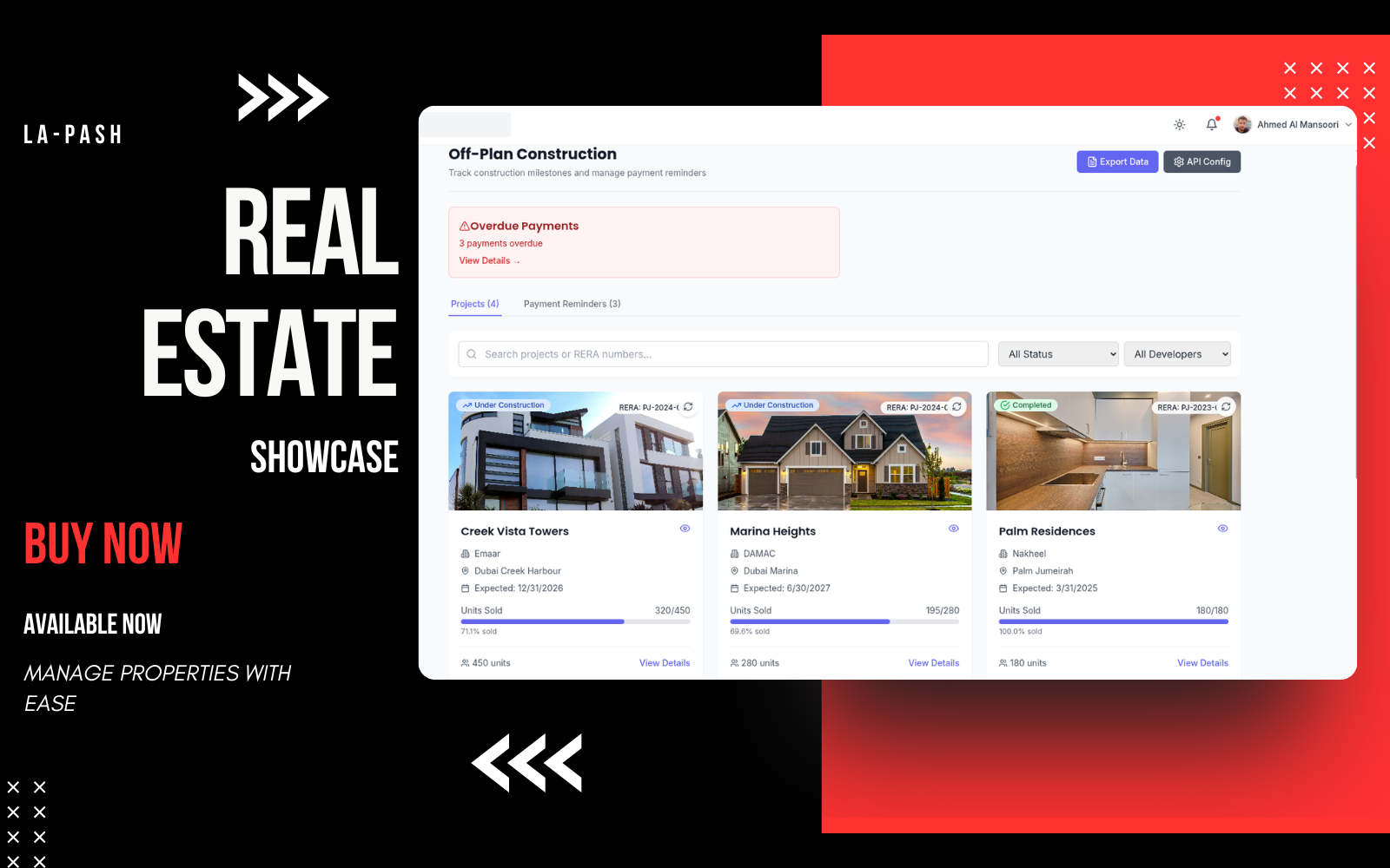 Welcome to our real estate command center, designed specifically for Agents and Brokers, Real Estate Companies . We bring together powerful, easy-to-use tools for listing management, payment-plan tracking, and in-depth developer analytics—right in one dashboard.