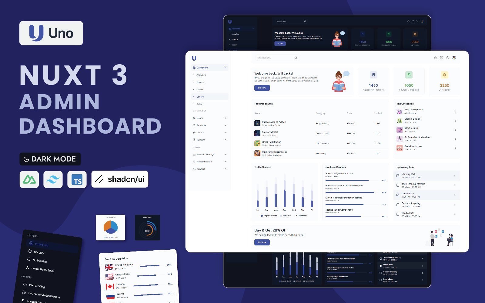 Uno is a modern, fully responsive, and feature-rich admin dashboard template built with Nuxt 3, TypeScript, Tailwind CSS, and ShadCN-Vue. Designed for developers, startups, and SaaS teams, Uno provides a scalable and high-performance foundation for building intuitive dashboards, admin panels, business management tools, eCommerce backends, and CRM systems.