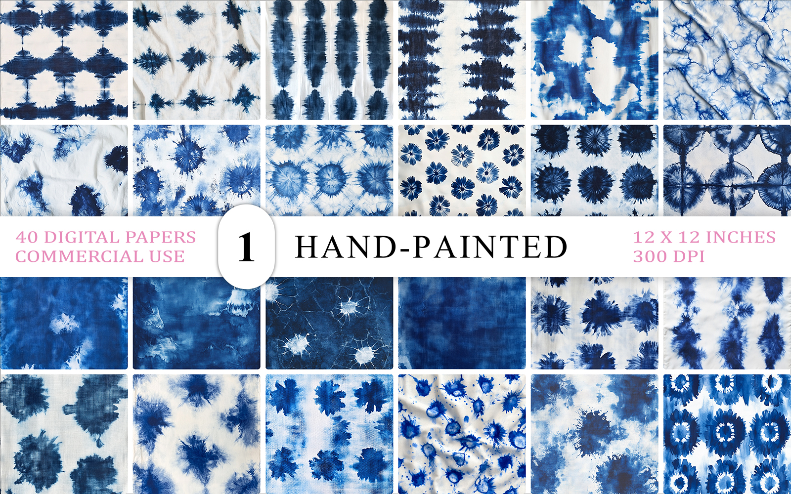 40 Shibori Tie-Dye Backgrounds | Hand-Painted Indigo Textures | Fabric & Home Decor Bundle