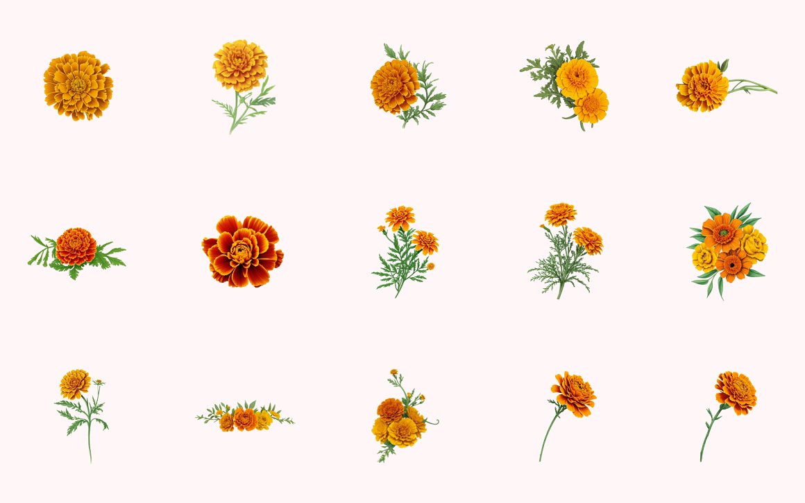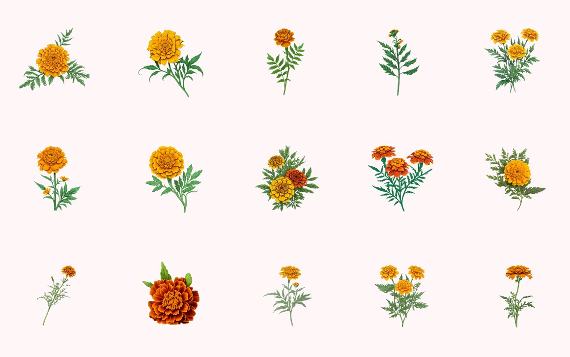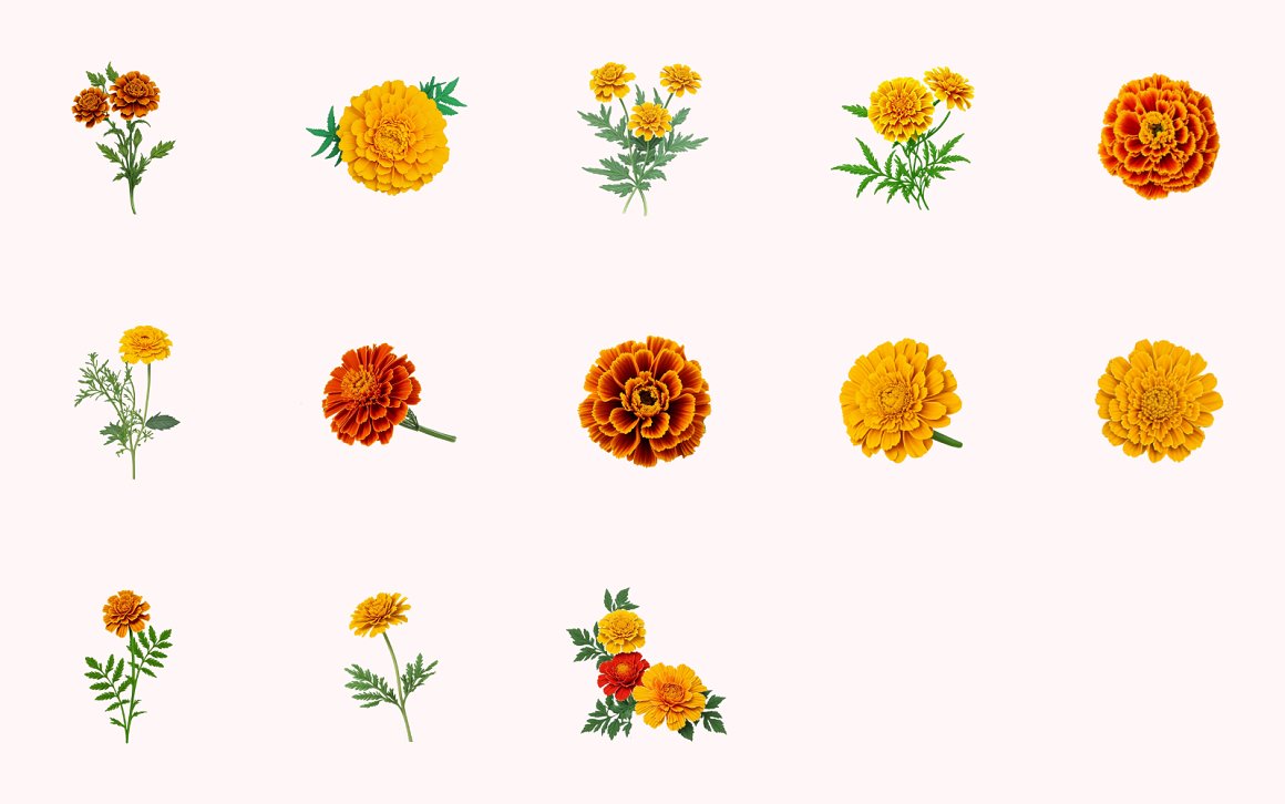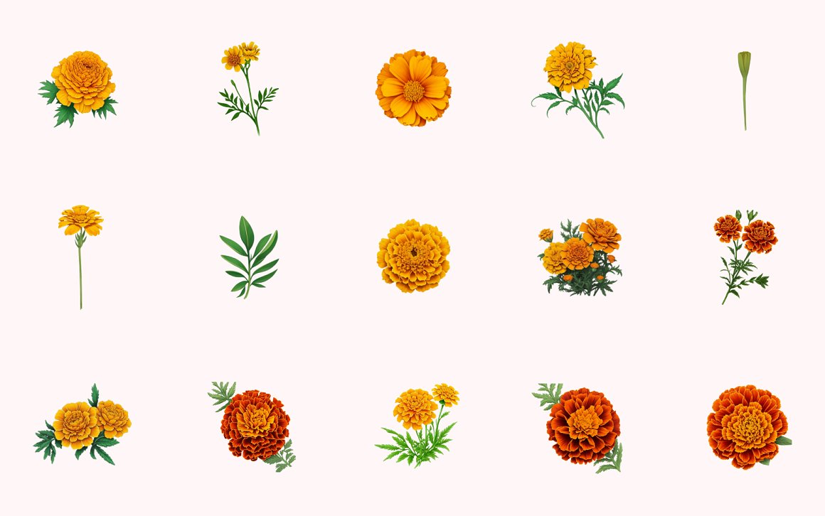 Marigold Flower Premium PNG Clipart presents a stunning collection of meticulously crafted digital illustrations showcasing vibrant marigold flowers in a premium-quality format. Each element is intricately designed, capturing the essence of these cheerful blooms with vivid colors and fine details. The use of the PNG format ensures a transparent background, facilitating easy integration into a variety of creative projects. Perfect for enhancing invitations, greeting cards, digital artwork, or graphic designs, this premium clipart collection adds a touch of warmth and elegance to your creations. Elevate your designs with the radiant beauty of marigold flowers, symbolizing positivity and joy, using this versatile and high-quality resource in your digital art endeavors.