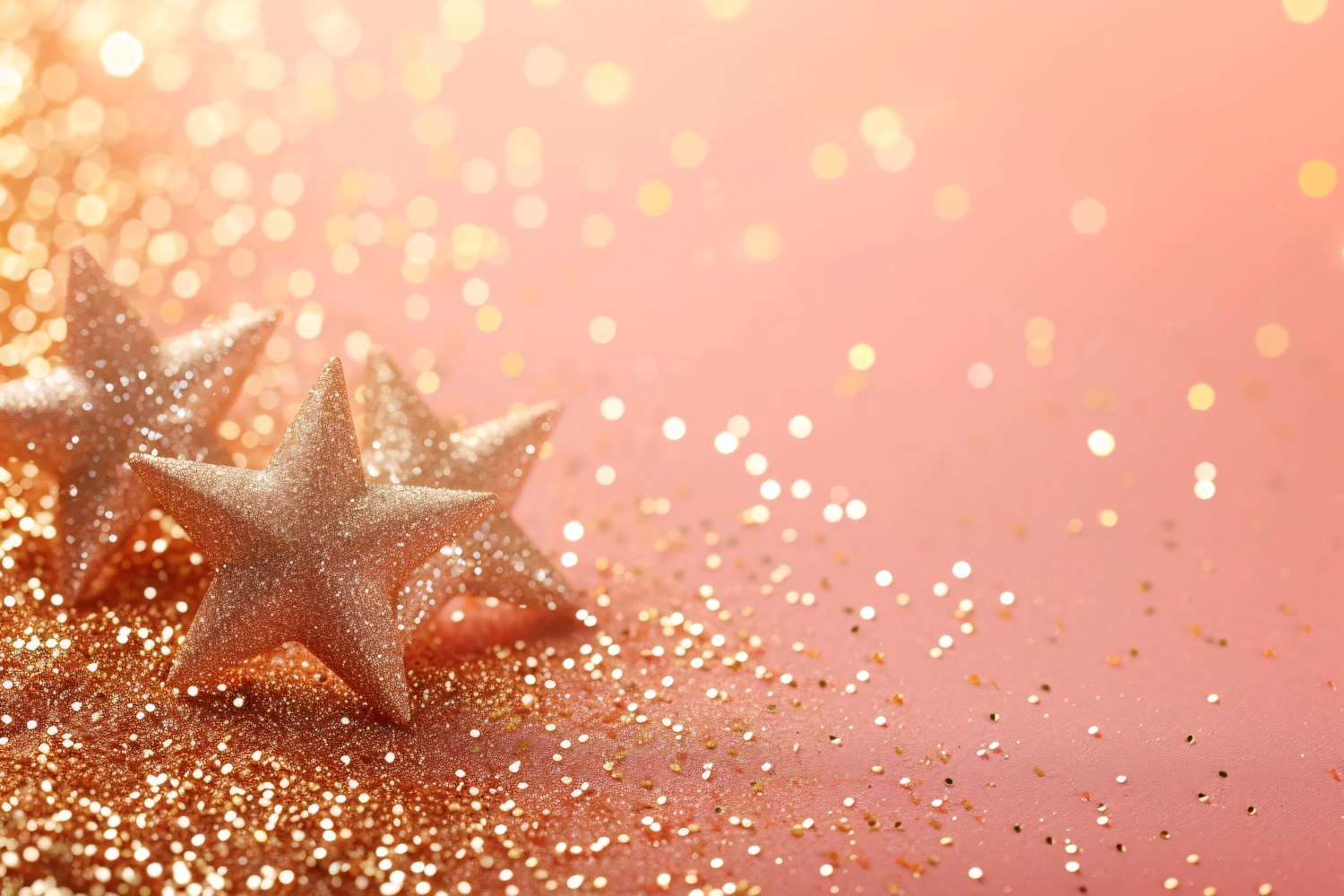 Birthday Background Pastel Peach Colours delicate powder pink Glitter Stars hang with soft caramel brown copy space