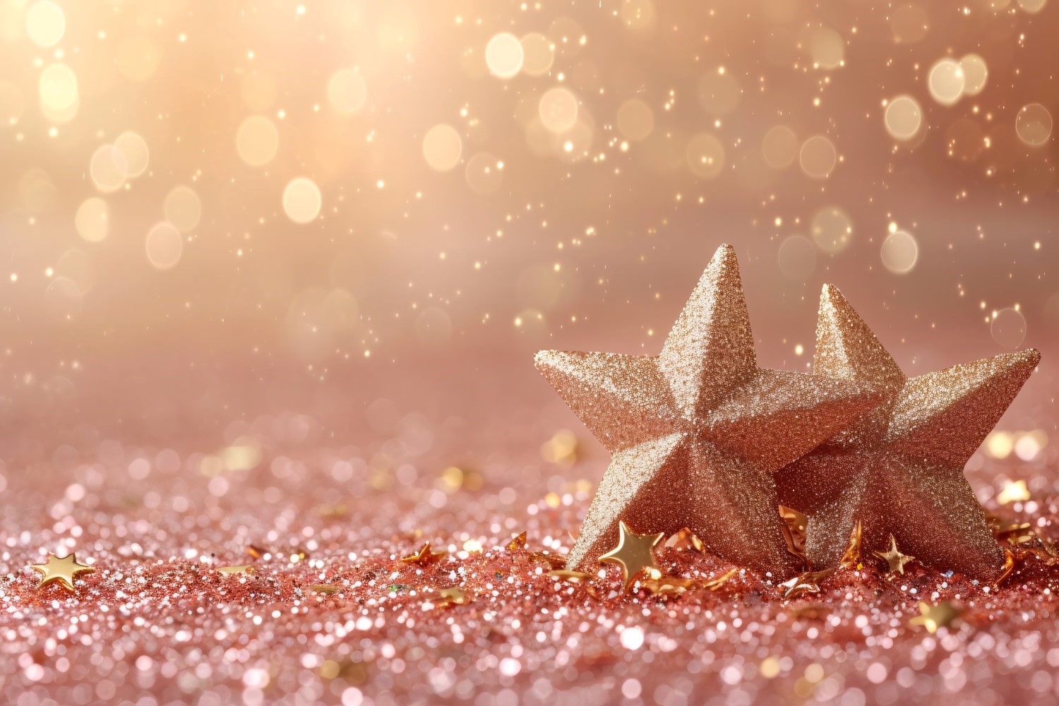 Birthday Background Pastel Peach Colours delicate powder pink Glitter Stars hang with soft caramel brown copy space