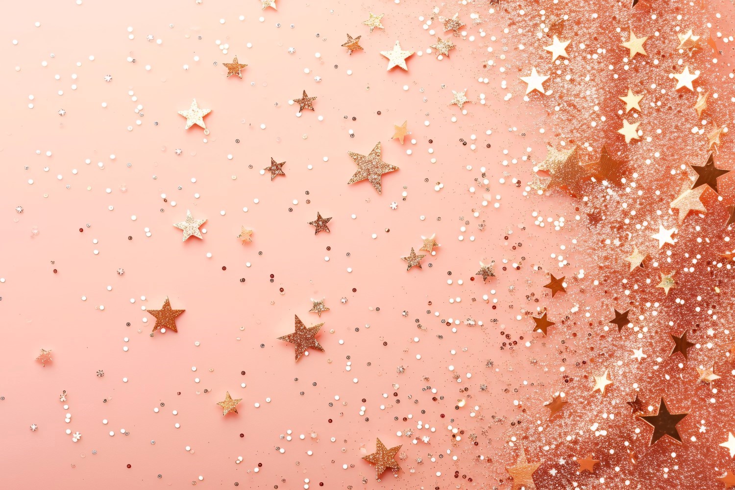 Birthday Background Pastel Peach Colours delicate powder pink Glitter Stars hang with soft caramel brown copy space