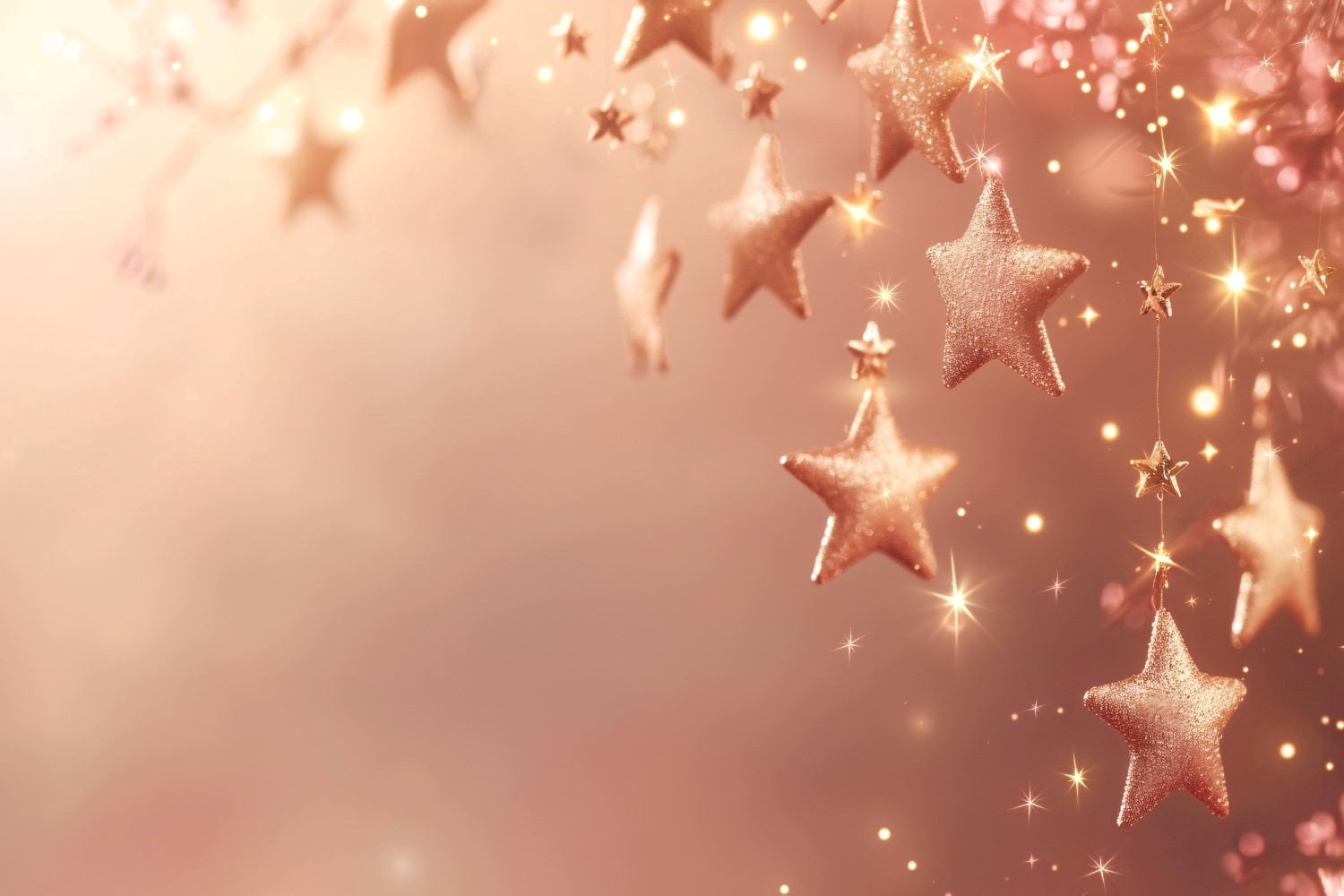 Birthday Background Pastel Peach Colours delicate powder pink Glitter Stars hang with soft caramel brown copy space