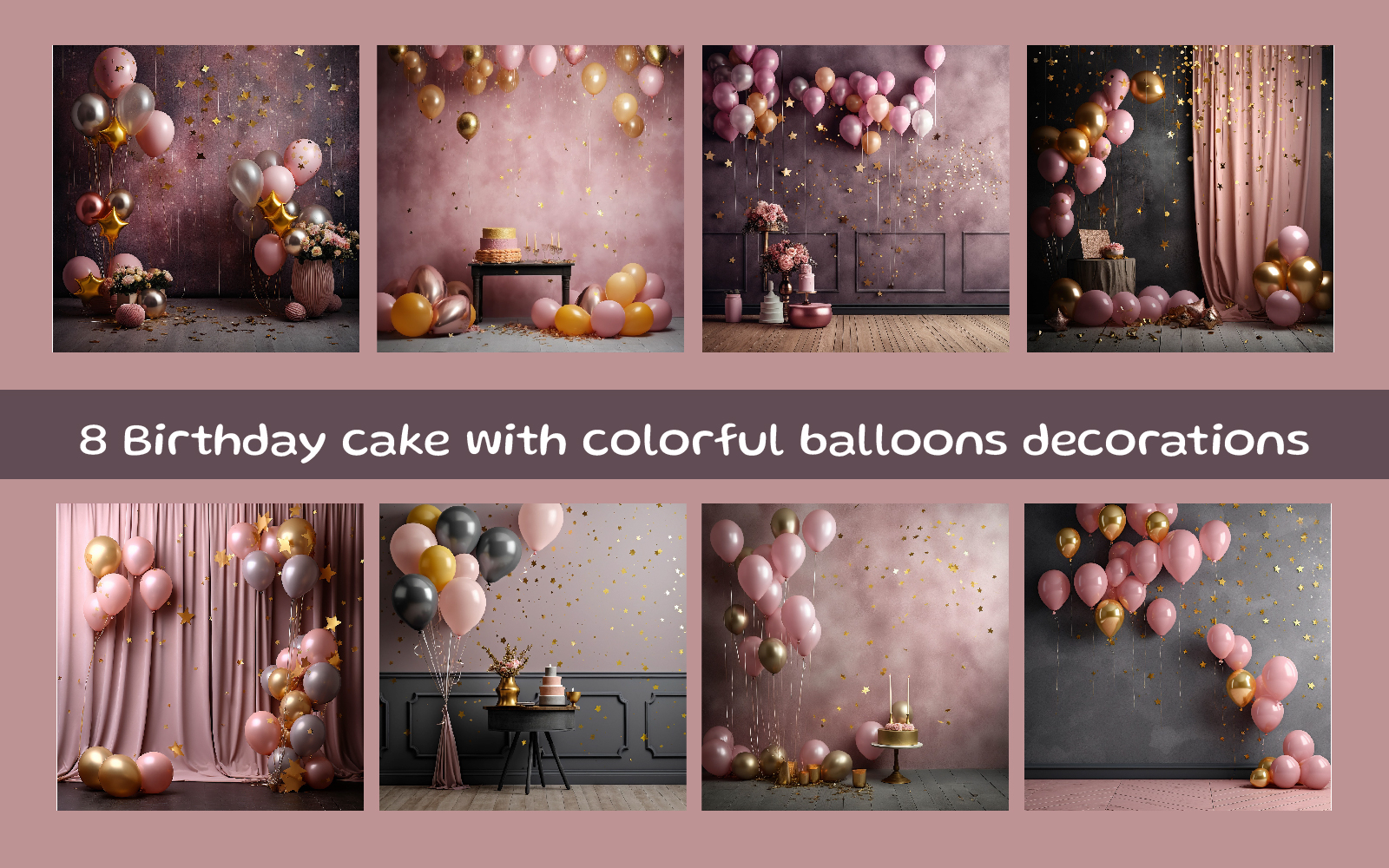 Birthday cake with colorful balloons decorations. Here is a set of colorful, sparkly balloon and arch, decoration AI image for your creative projects. Perfect for graduation invitations, birthday party props, baby shower, wedding decor, planner stickers, scrapbooking, or any of your celebration designs