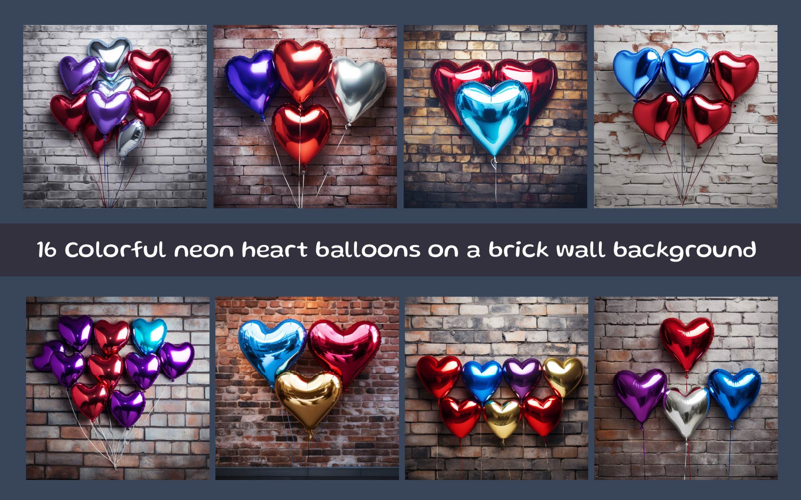 Colorful neon heart balloons on a brick wall background. Colorful balloons realistic composition with colorful background and empty space surrounded by flying confetti and balloons illustration. Perfect for social media post, banner, poster, event, party, decoration, invitation and etc. it adds a touch of artisanal charm to your creative projects.