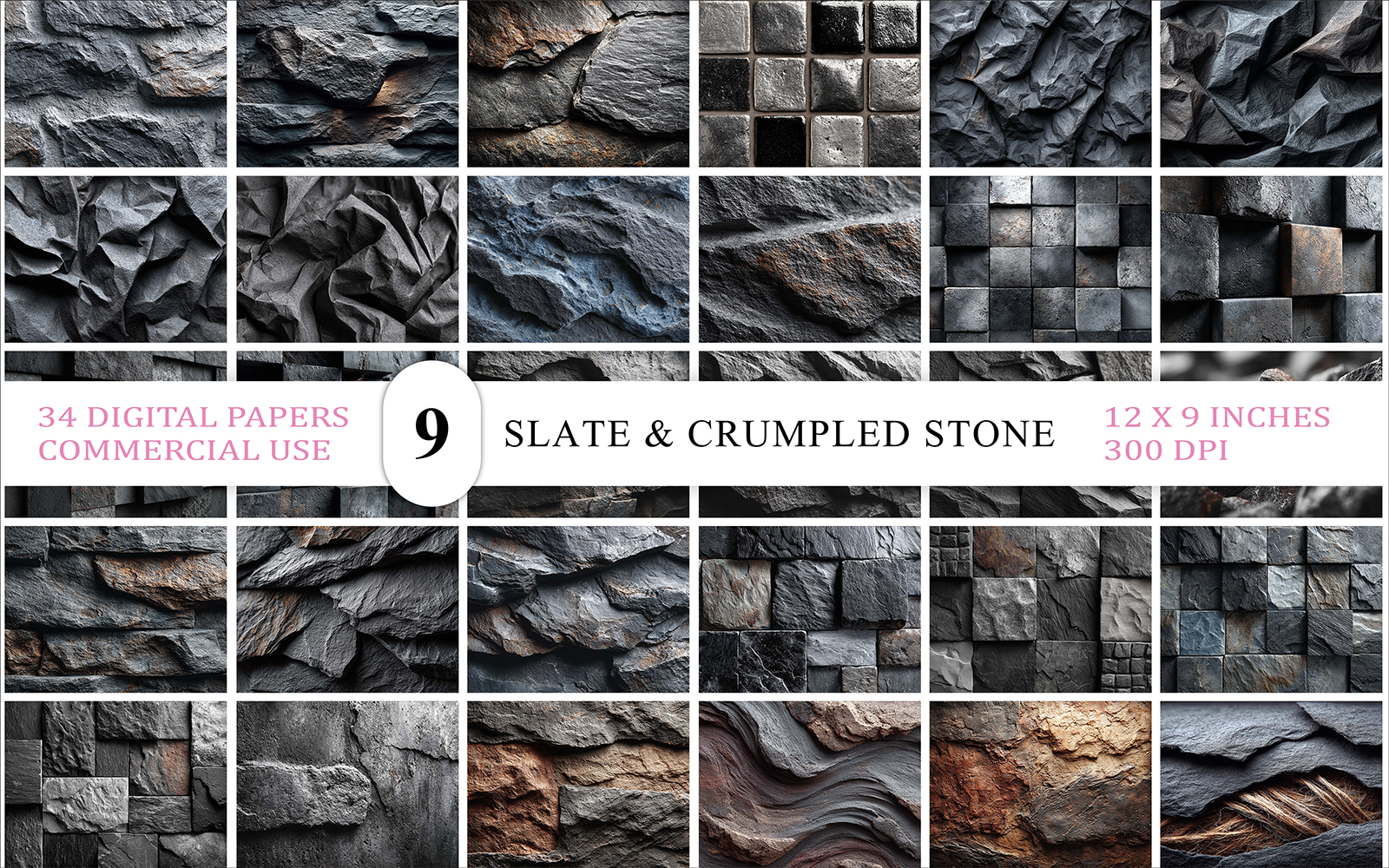 This pack includes 34 Dark Slate & Crumpled Stone Texture digital papers/backgrounds.