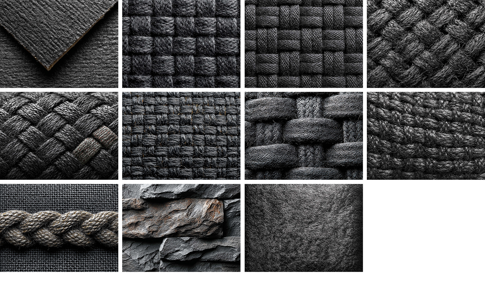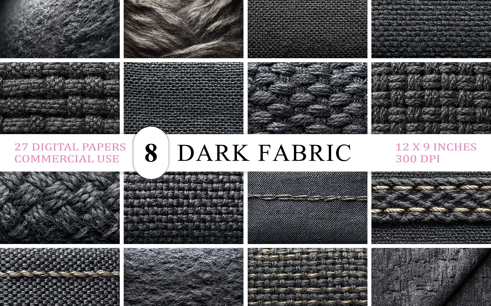 Bring depth and texture to your designs with this Dark Fabric Texture Bundle, This exclusive collection includes a variety of 27 high-resolution textile textures in rich black tones featuring detailed weaves, soft knits, hand stitches, twill surfaces, and raw fabric edges.