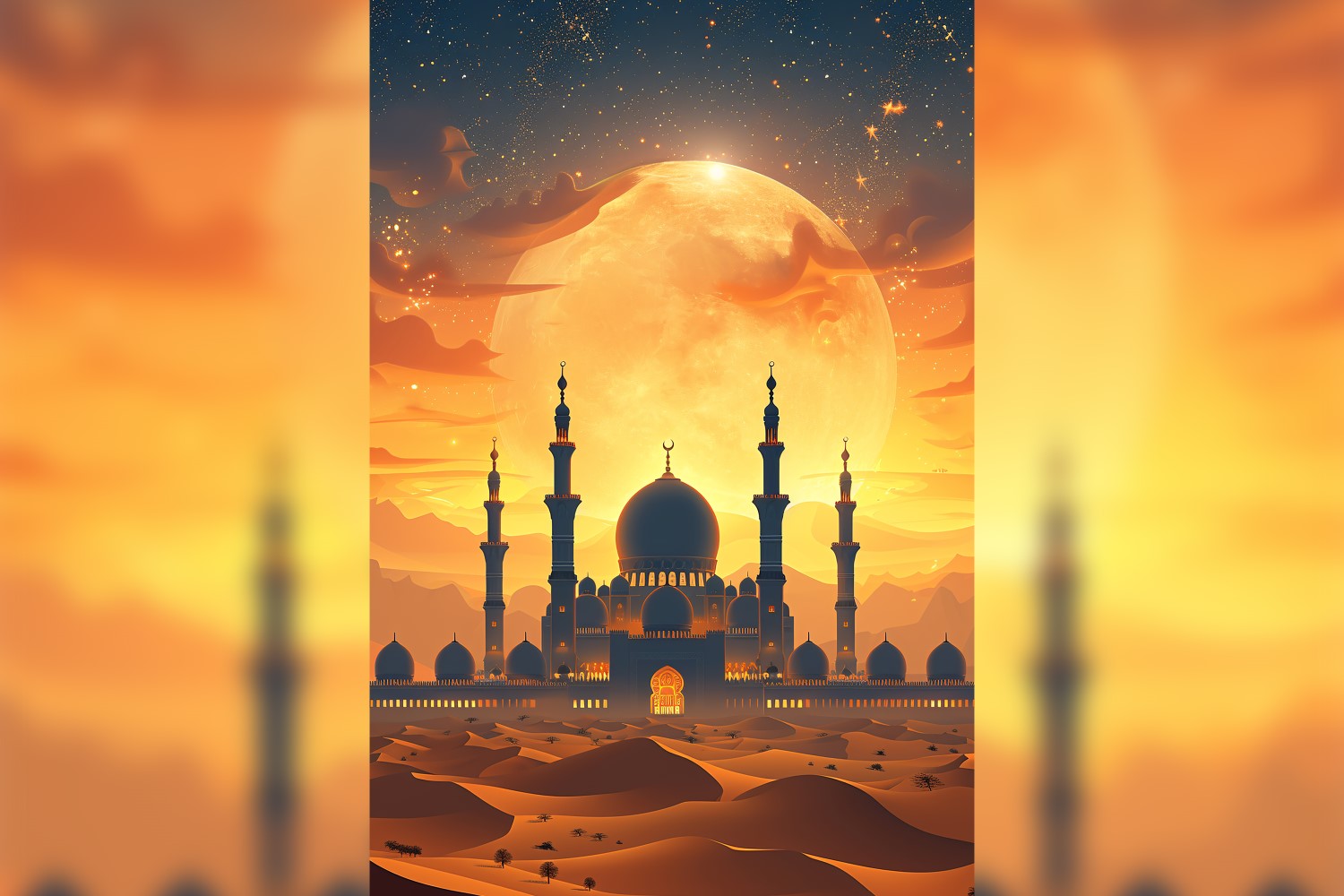 Elevate your Ramadan publications with our captivating designs, blending intricate lanterns, soft powder glitter, and celestial pink stars against a serene moonlit backdrop. Capturing the essence of fasting in Islam, our Ramazan Mubarak background serves as a poignant reminder of spiritual devotion and introspection. Whether for book covers, paper printing, or digital art, our designs infuse your creations with the sacred ambiance of Ramadan Kareem.