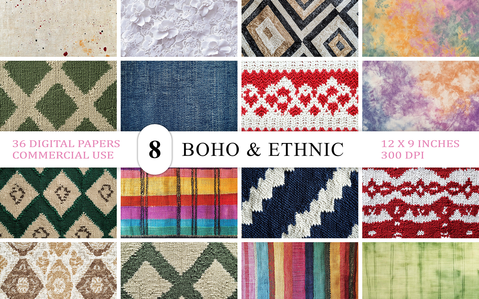 This pack includes 36 Boho & Ethnic Fabric Texture digital papers/backgrounds.
