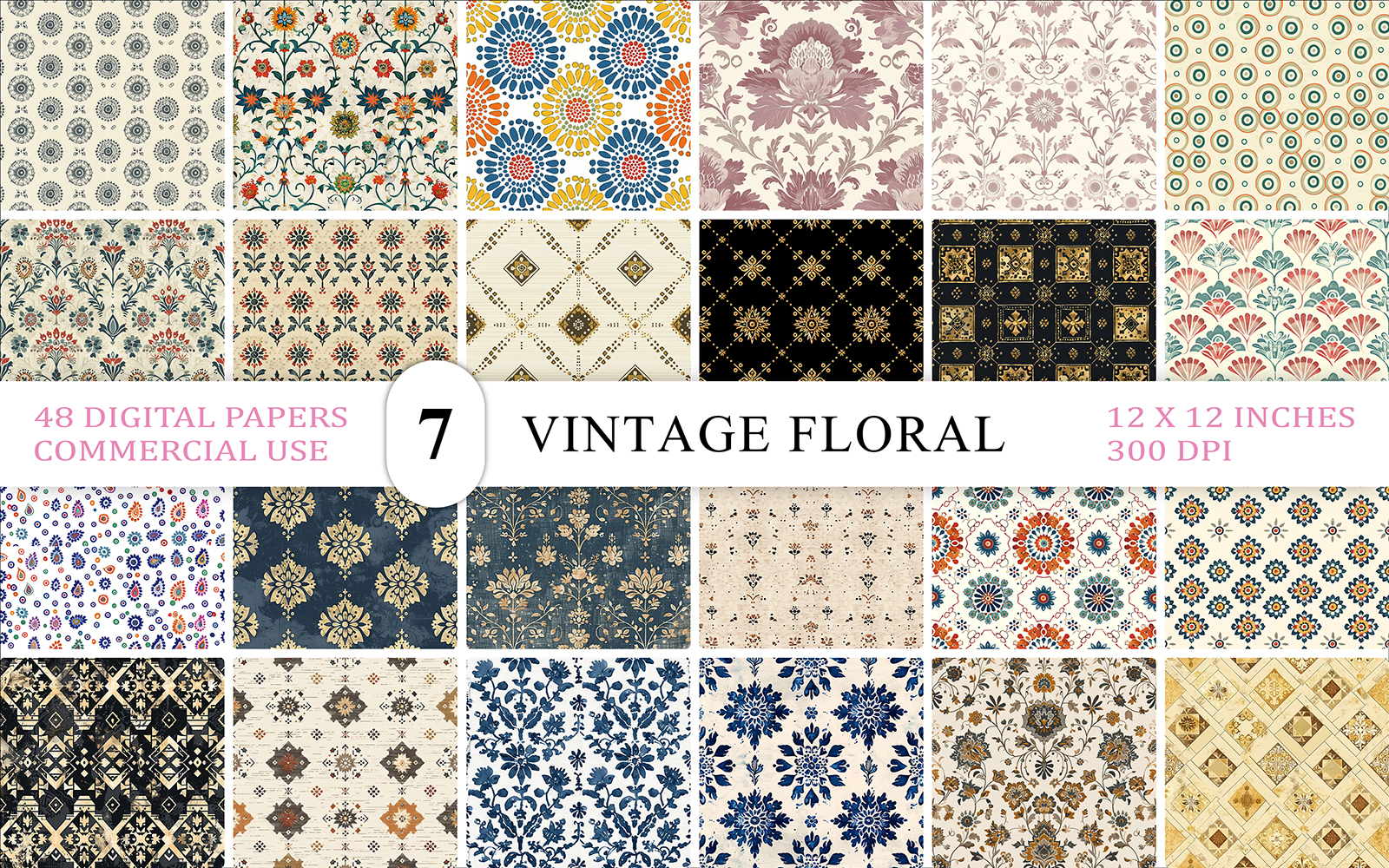 48 Vintage Floral Seamless Pattern Texture Digital Paper Bundle | Premium Quality | Commercial Use Ready