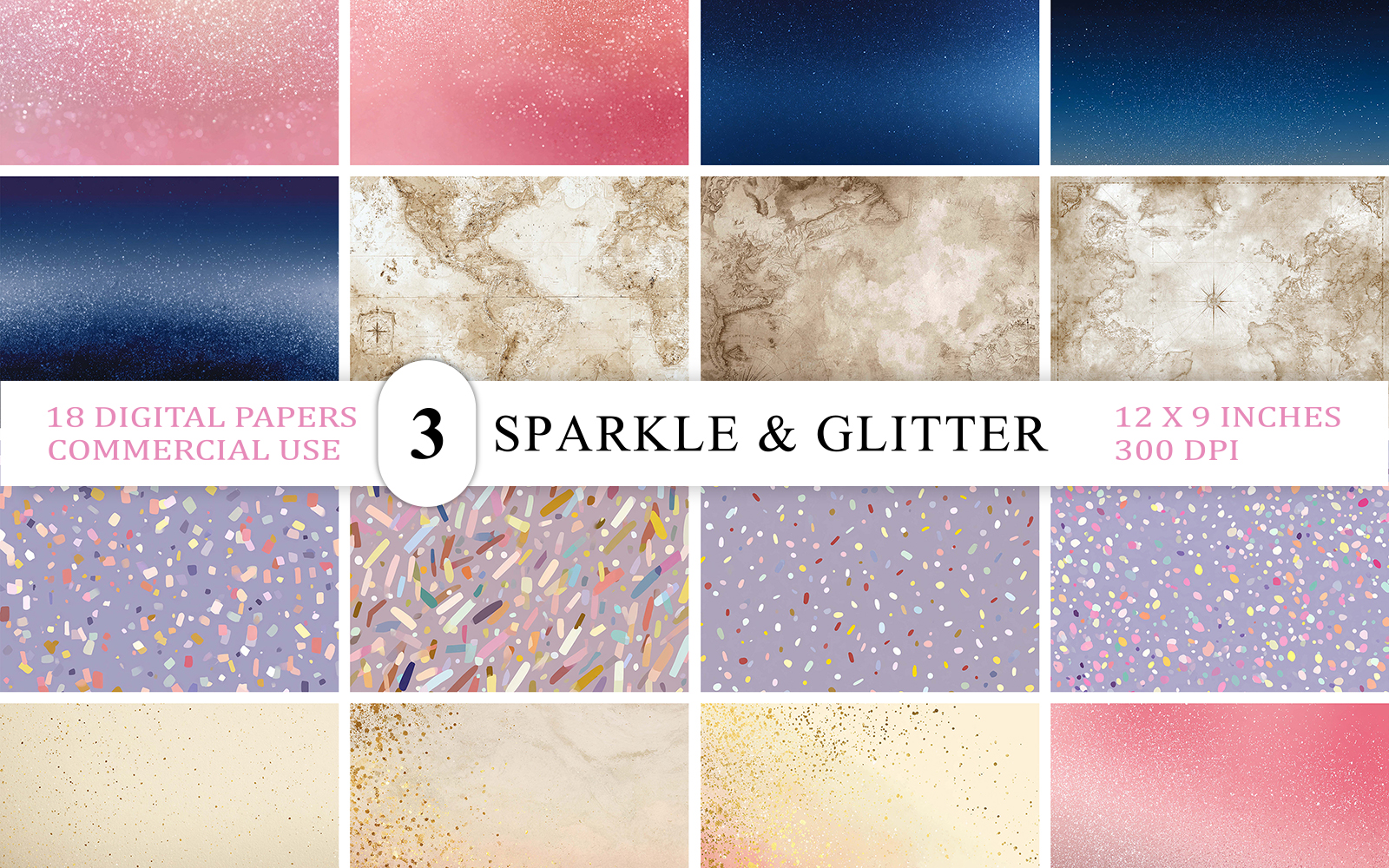 This pack includes 18 Sparkle & Glitter Bundle digital papers/backgrounds.