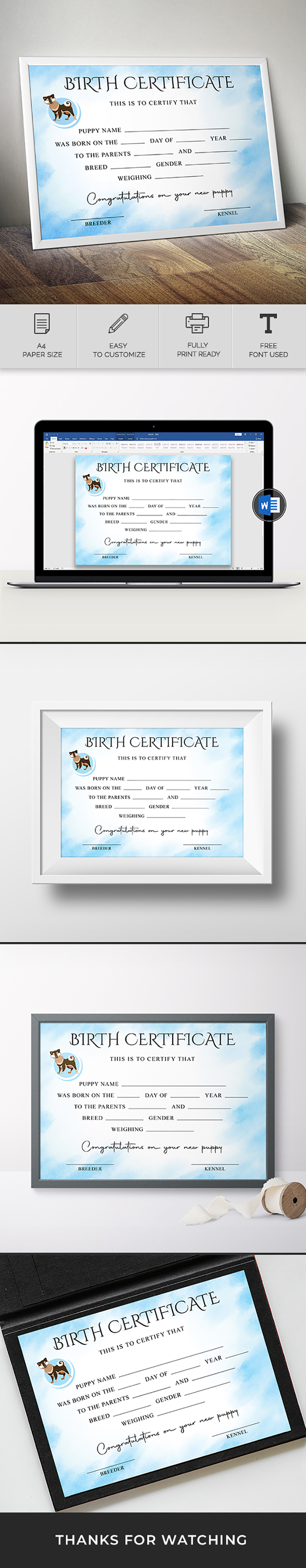 Certificate Template Word Printable Puppy Birth Certificate Clean Certificates Simple Design Editable MS Word Certificate of Puppy Birth.