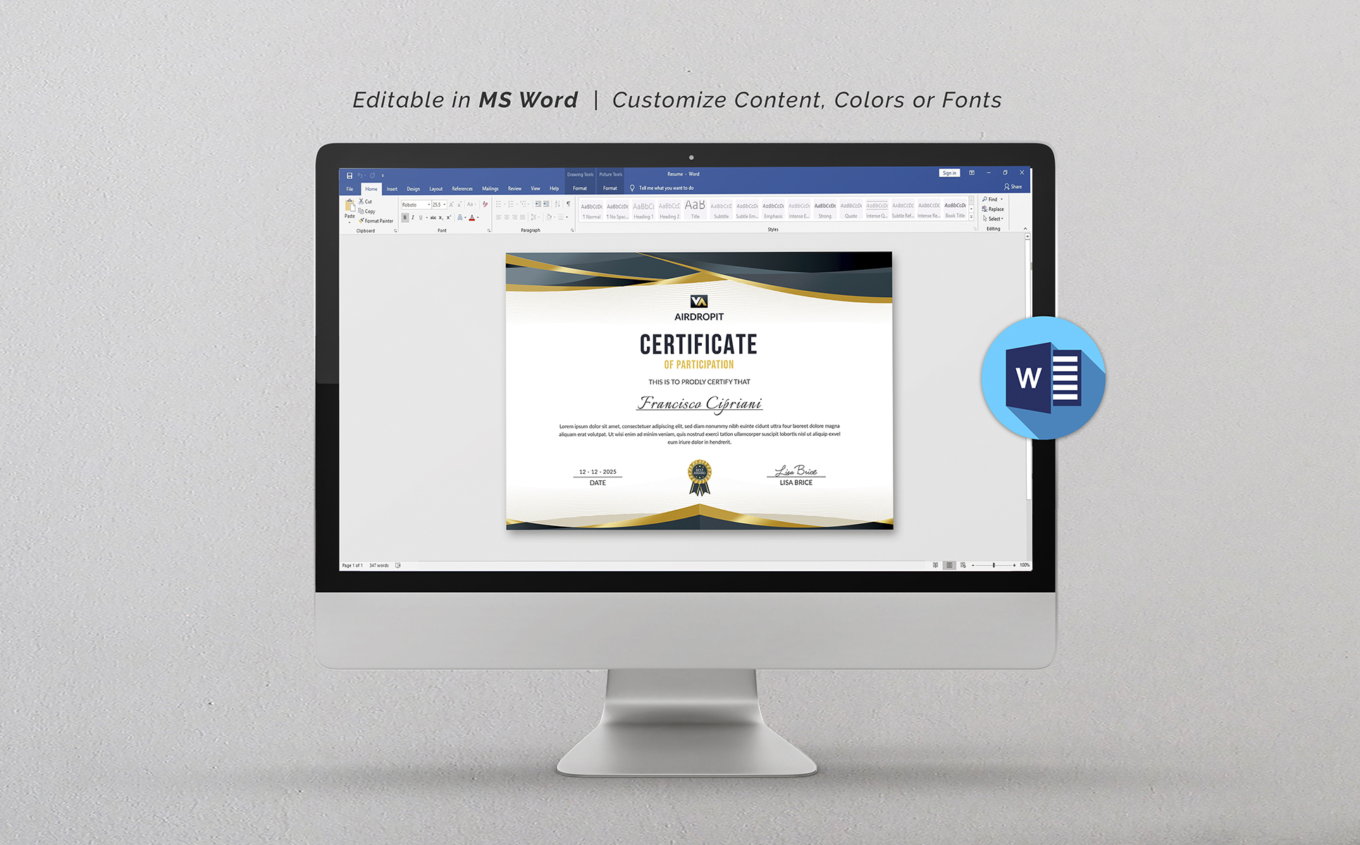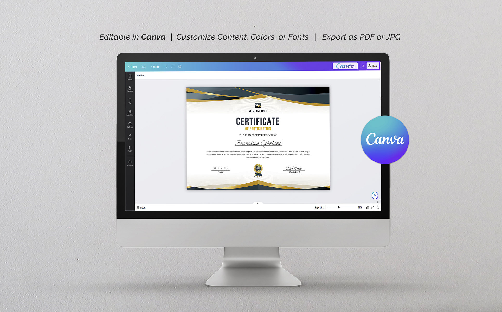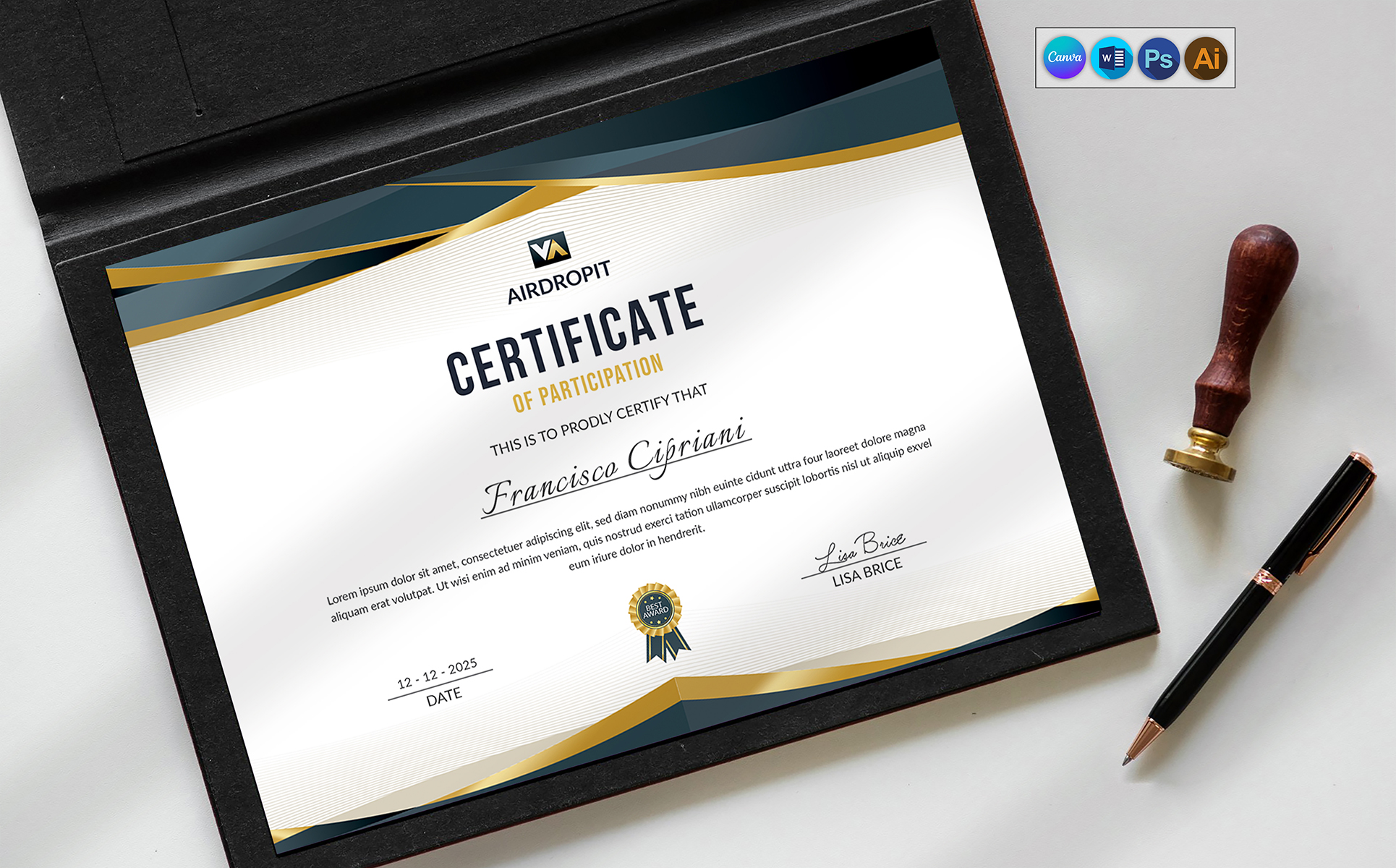 Fully editable and easy to customize, this certificate template works seamlessly across Canva, Microsoft Word, Adobe Photoshop, and Illustrator. Whether you need to adjust names, logos, colors, or fonts, you can create a polished and personalized certificate in minutes.