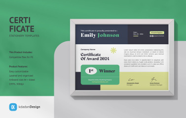 Overview : Clean, Modern and Professional Certificate. Fully customizable, easy to use and replace colors & text, logo containers are Smart-Objects to make it easy for you to add logo and edit files.