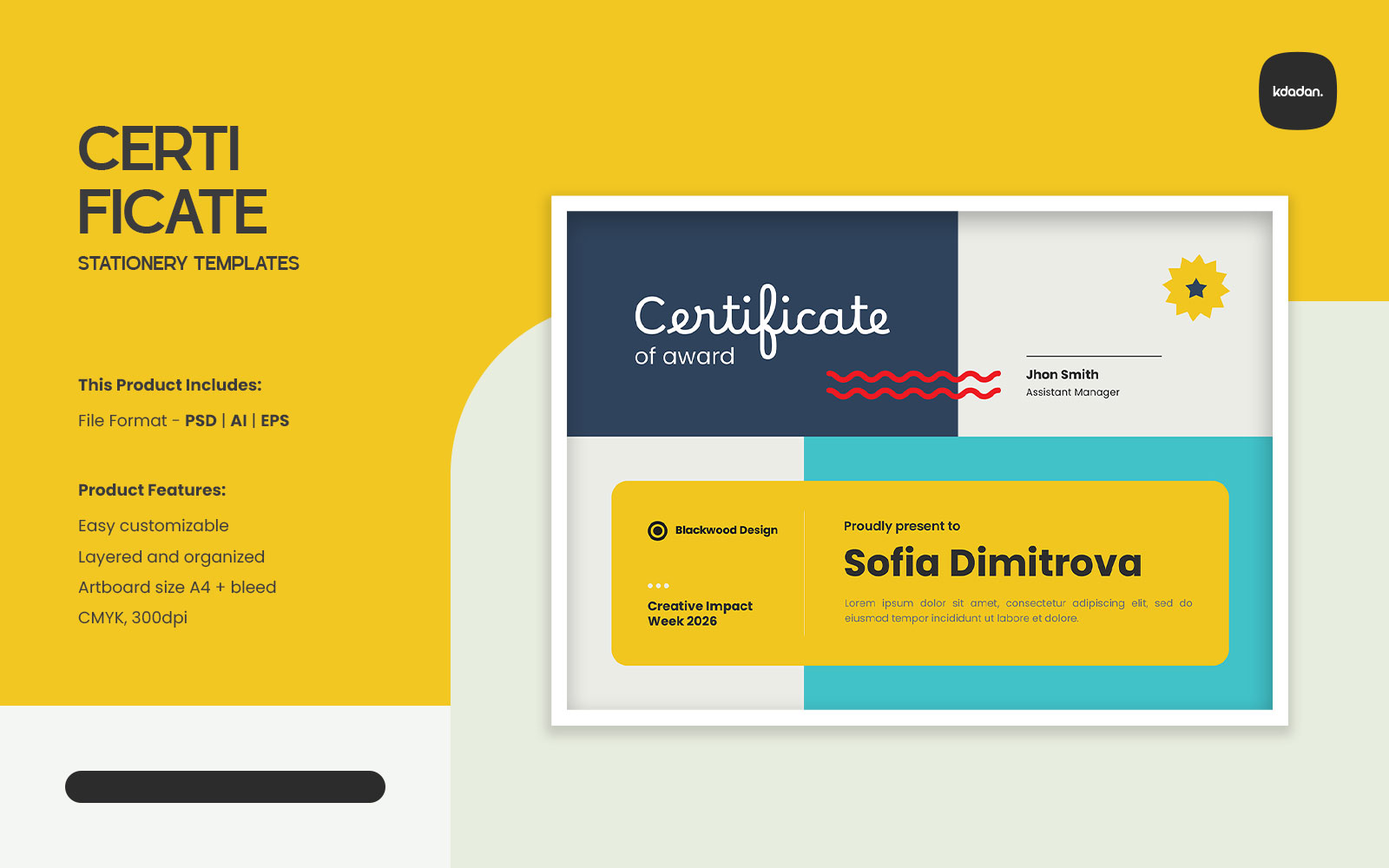Overview : Clean, Modern and Professional Certificate. Fully customizable, easy to use and replace colors & text, logo containers are Smart-Objects to make it easy for you to add logo and edit files.