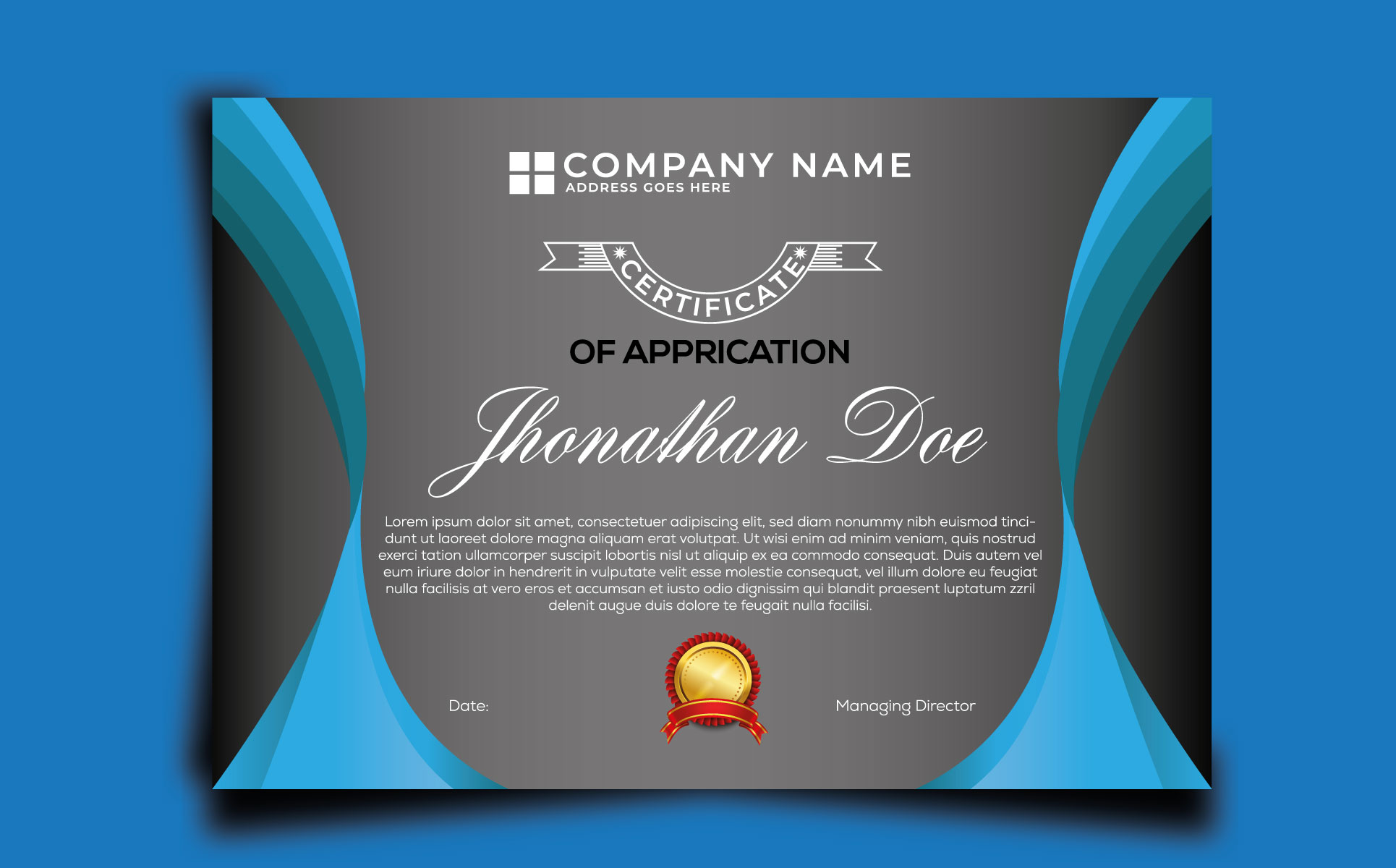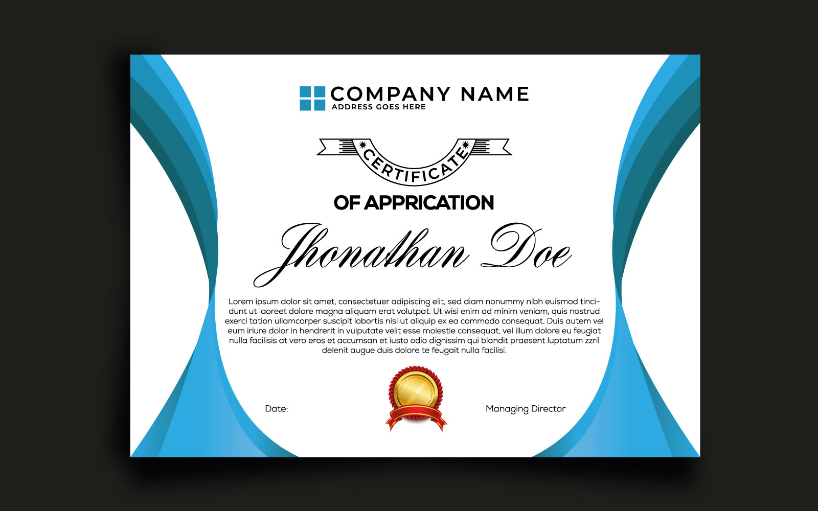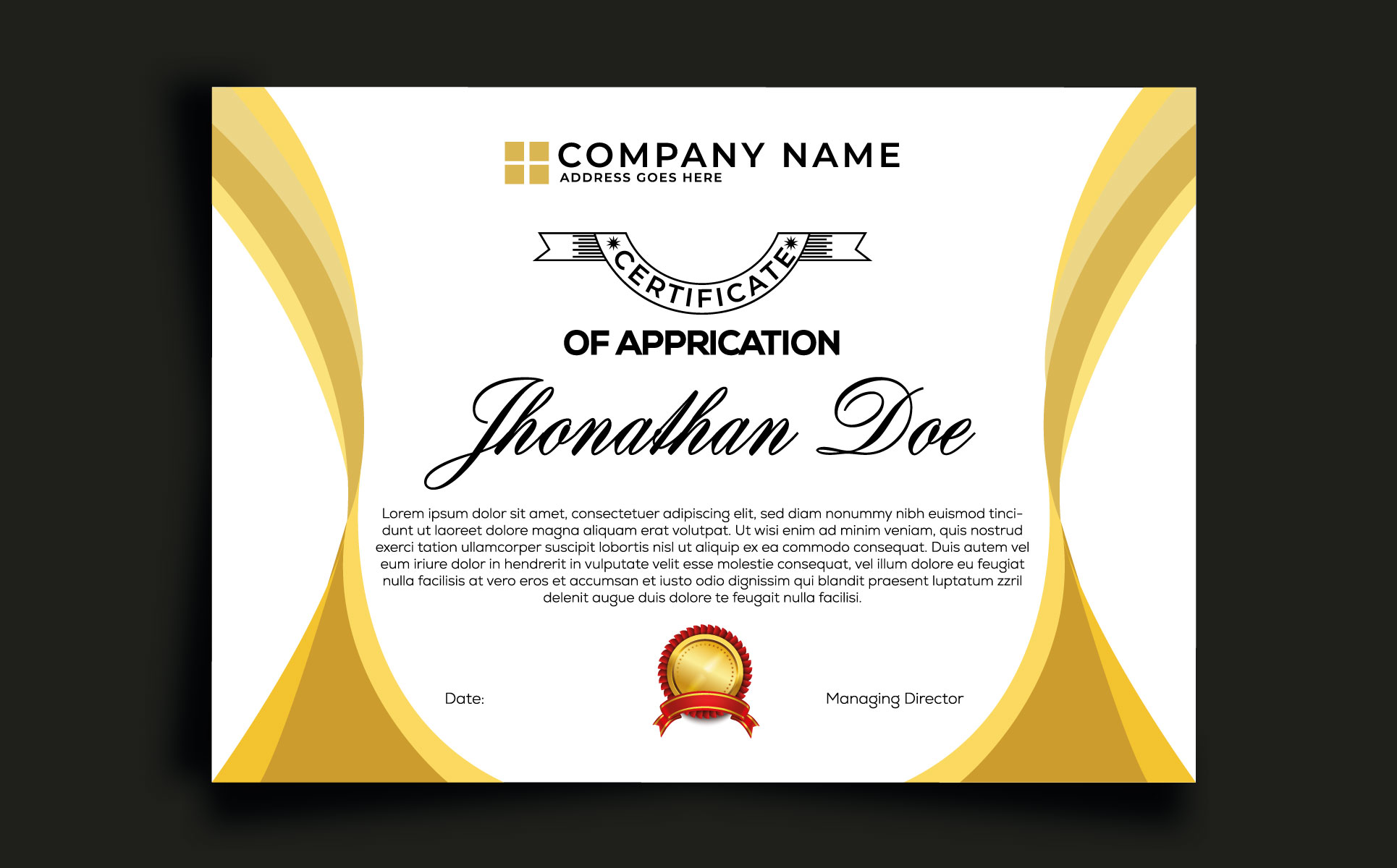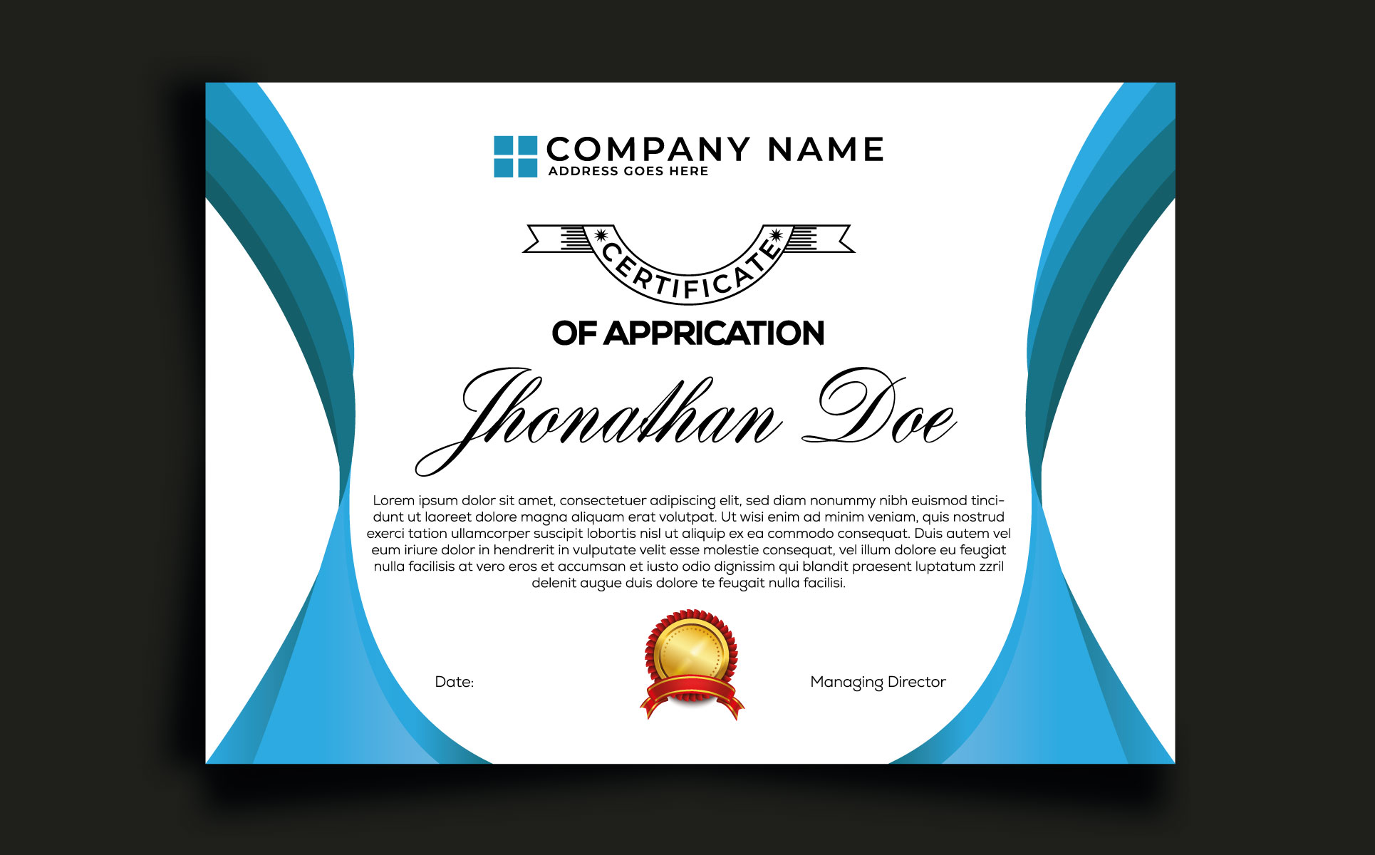 Modern Certificate Design Template is editable text, logo, color & resizable/scalable vector based designed in Adobe Illustrator. It’s fully editable, customizable & saleable without losing resolution. Ready to print with professional template setup with CMYK, Layered, 300DPI, Bleeds & Safe Guides, Trims and free font.