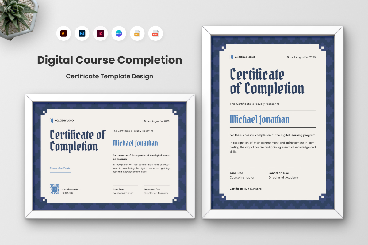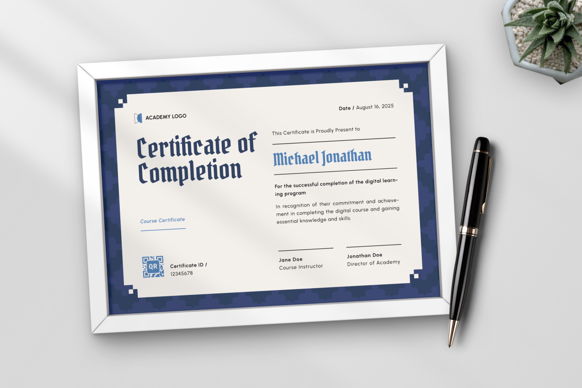 Celebrate achievement with a certificate that blends digital-friendly design and premium layout. Featuring structured typography and standout participant name section, it’s ideal for creators, academies, and e-learning providers.
