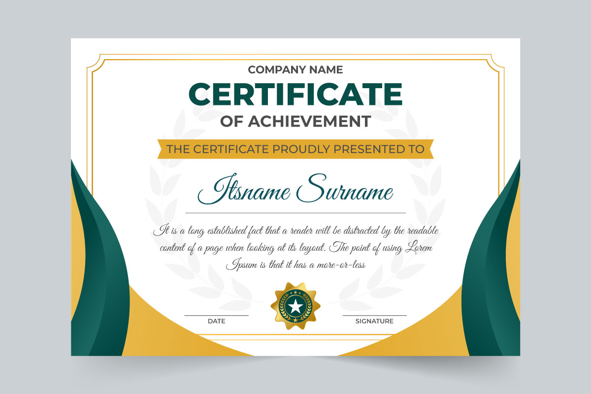 Office or university certificate vector. Certificate of achievement and diploma design with golden and green colors. Special award certificate vector for occasions of sports. Academic certificate design with abstract shapes and calligraphy.