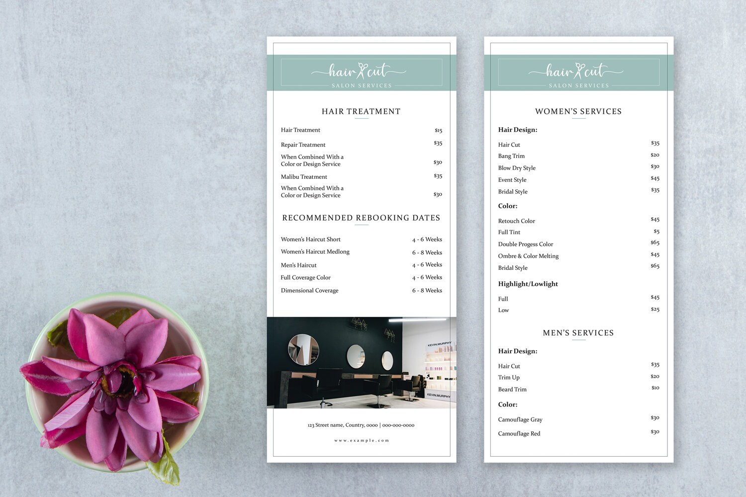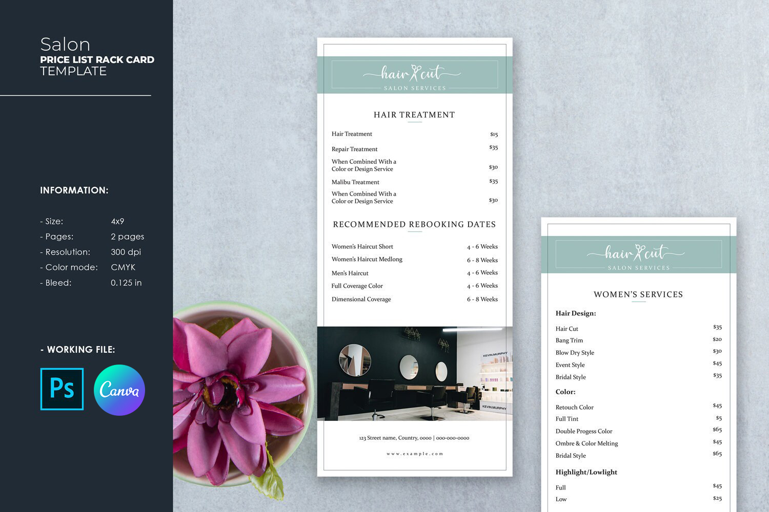 Elegant Salon and Spa Price List Rack Card Template, perfect for showcasing services and prices with a stylish, modern layout. Fully editable and print-ready for beauty professionals.INSTANT DOWNLOAD