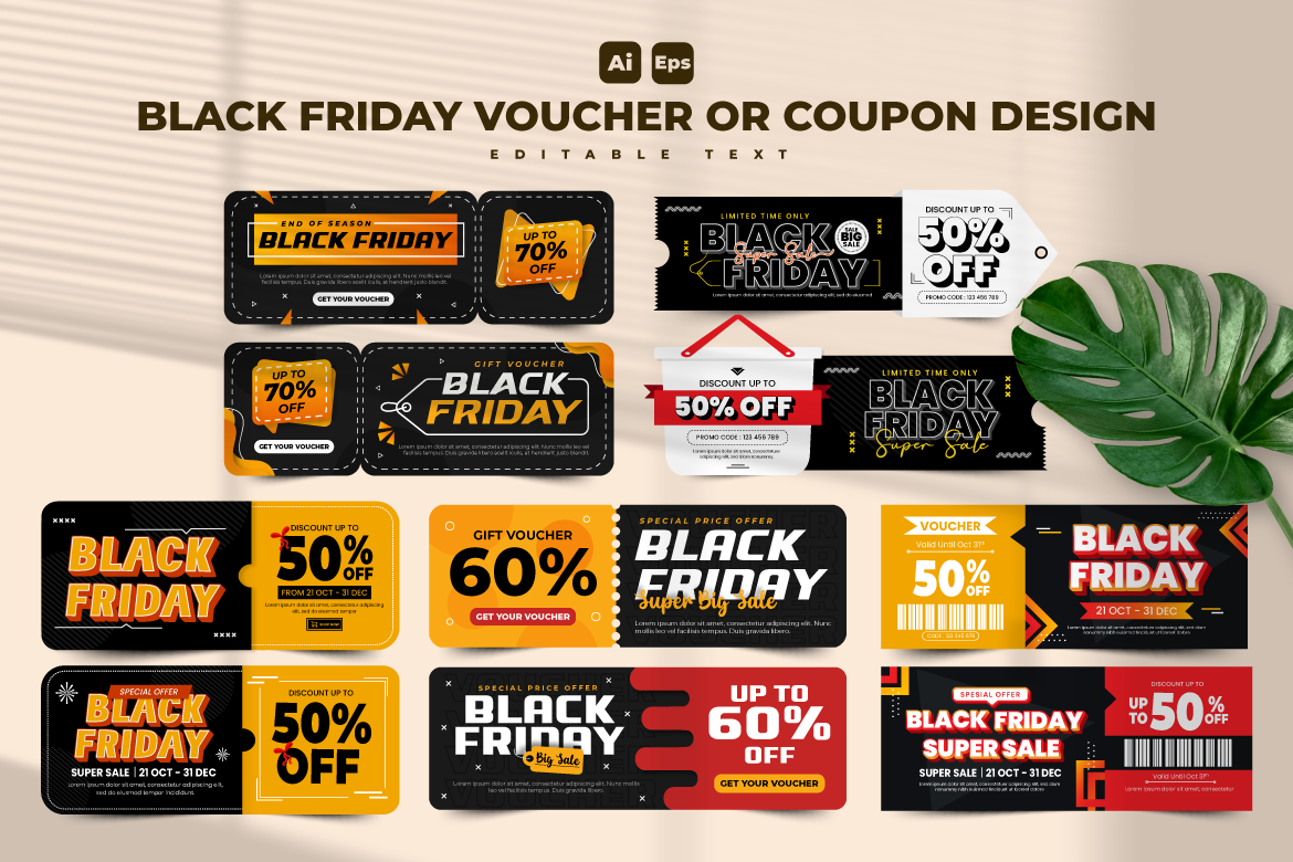 Black Friday is easy and interesting. get five Voucher or Coupon design templates with this elegant, modern, uncomplicated, minimalistic, and expertly-designed Black Friday design graphic set that will help you promote the goals of any project. The professional design of this template allows you to use it for any kind of business, corporate, corporate, or marketing promotion.