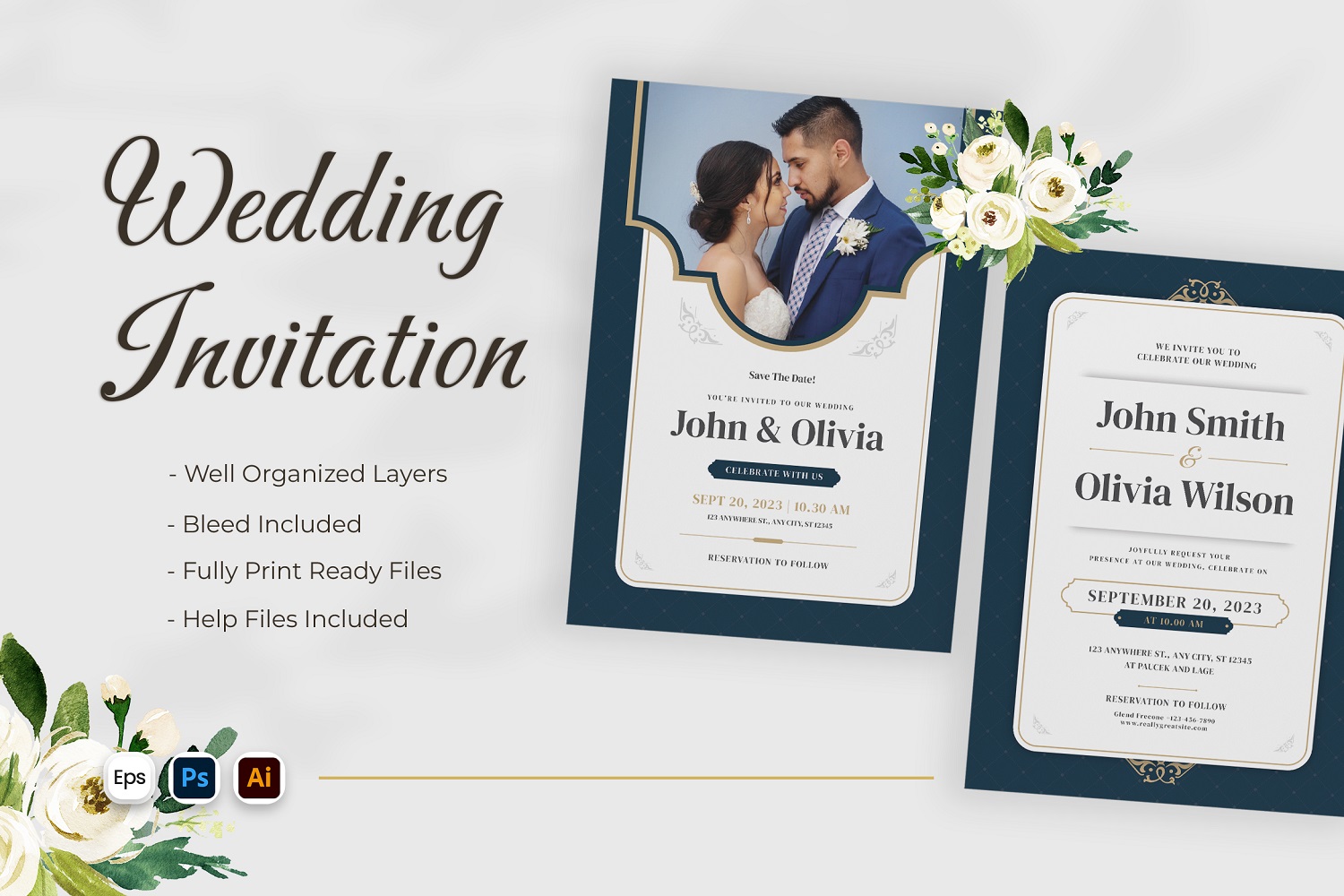 This Wedding Invitation template has fully editable and customizable PSD and AI files. This Wedding Invitation template also has creative style, and it's suitable for your any purpose.