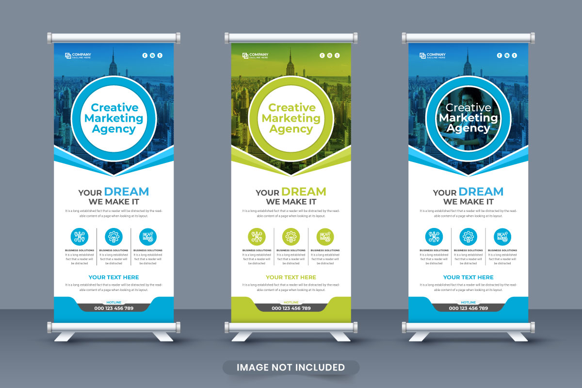 Business promotion roll up banner vector. Creative marketing agency standee roll up banner vector with aqua and green colors. Business promotion and presentation banner design for marketing. Company advertisement roll up banner design.