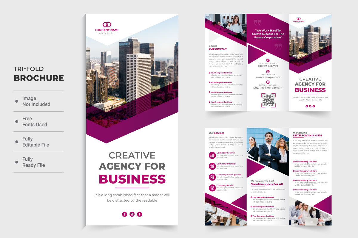 Business promotion tri fold brochure. Creative business agency advertisement brochure design with dark magenta color. Marketing agency promotional poster and tri fold brochure design. Business tri fold brochure with a photo placeholder.