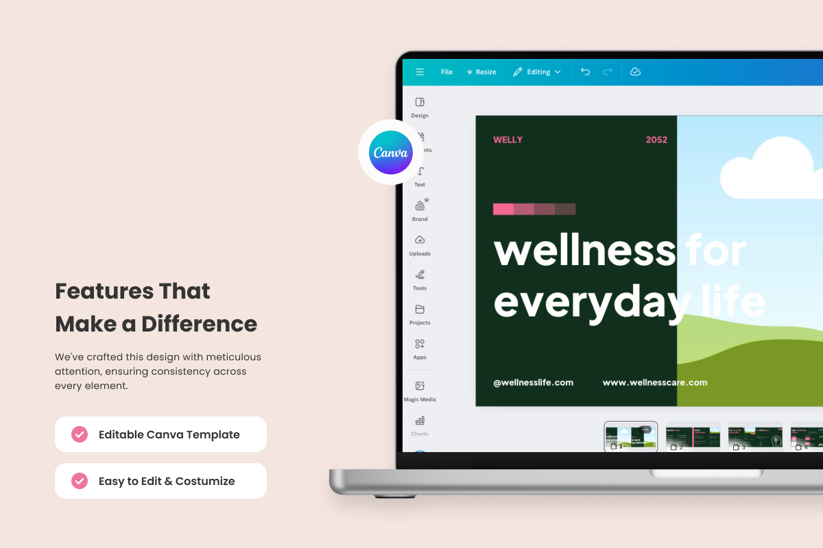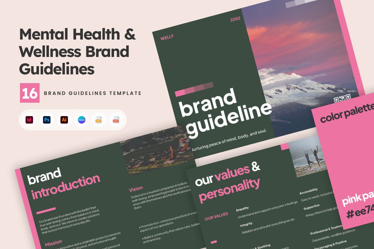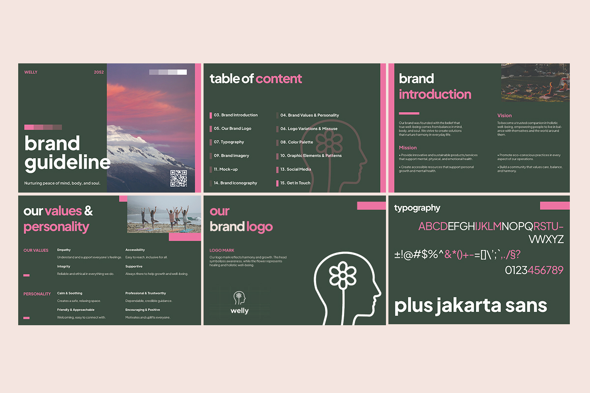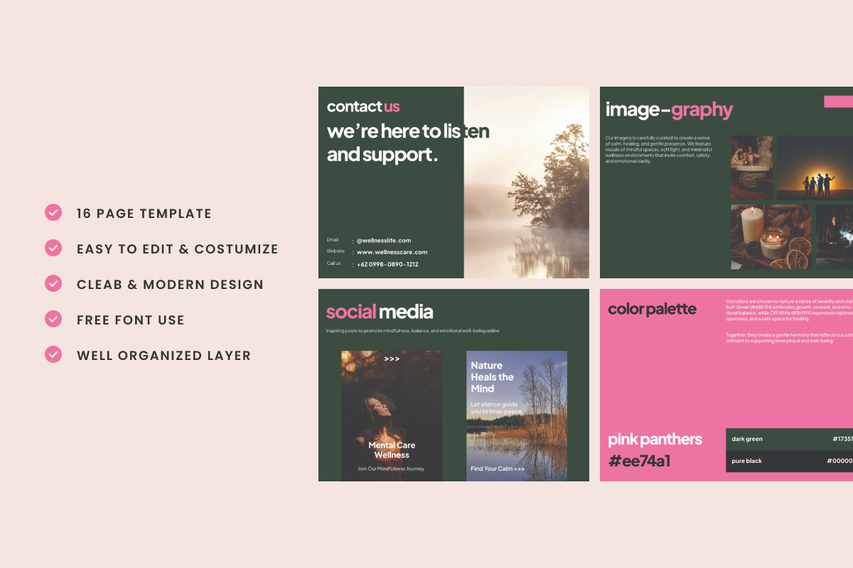 Great for mental health organizations, coaches, and wellness entrepreneurs who want to communicate their values clearly. Use it to share your brand rules, color palette, tone of voice, and design system in a visually cohesive manner that inspires trust.