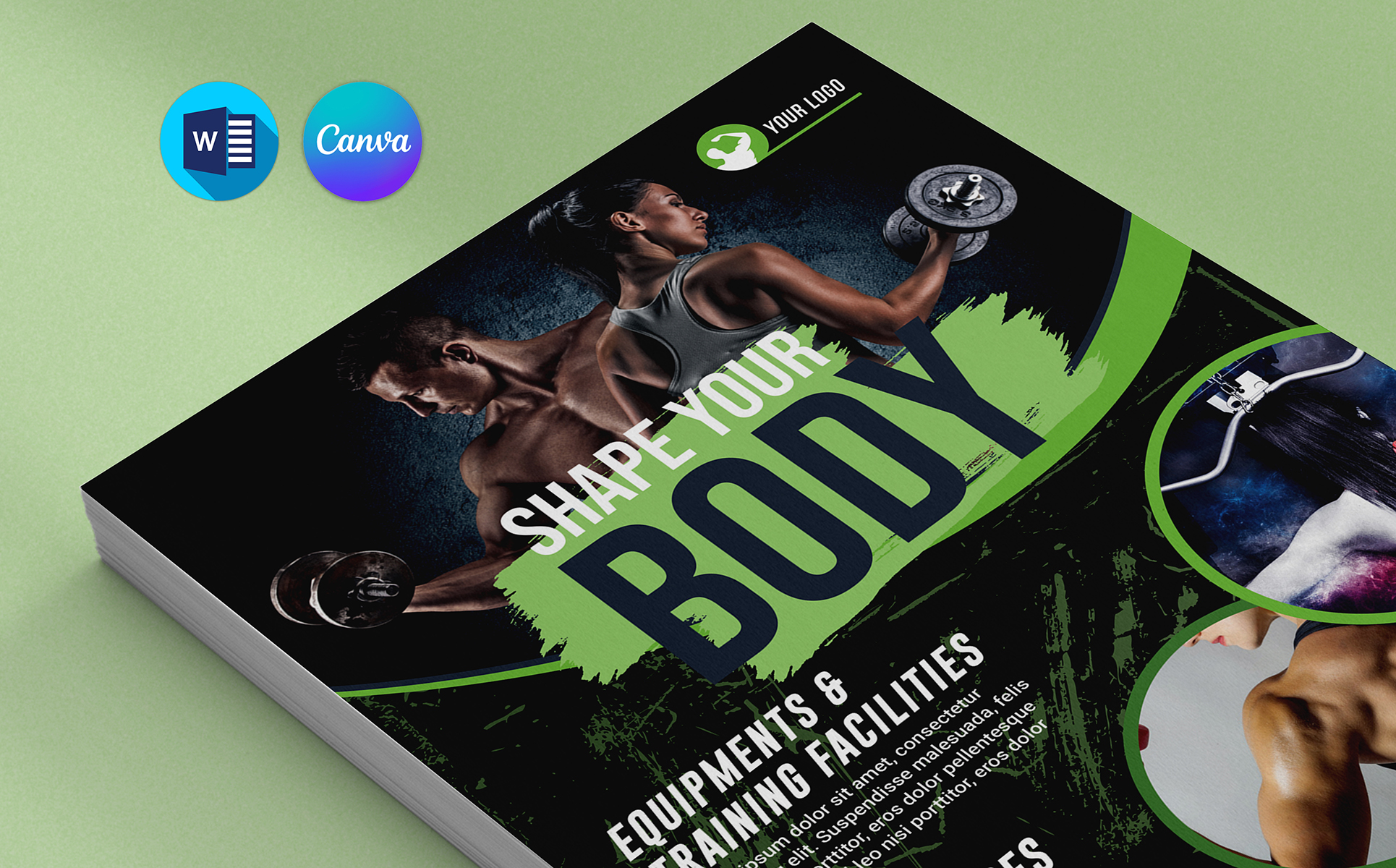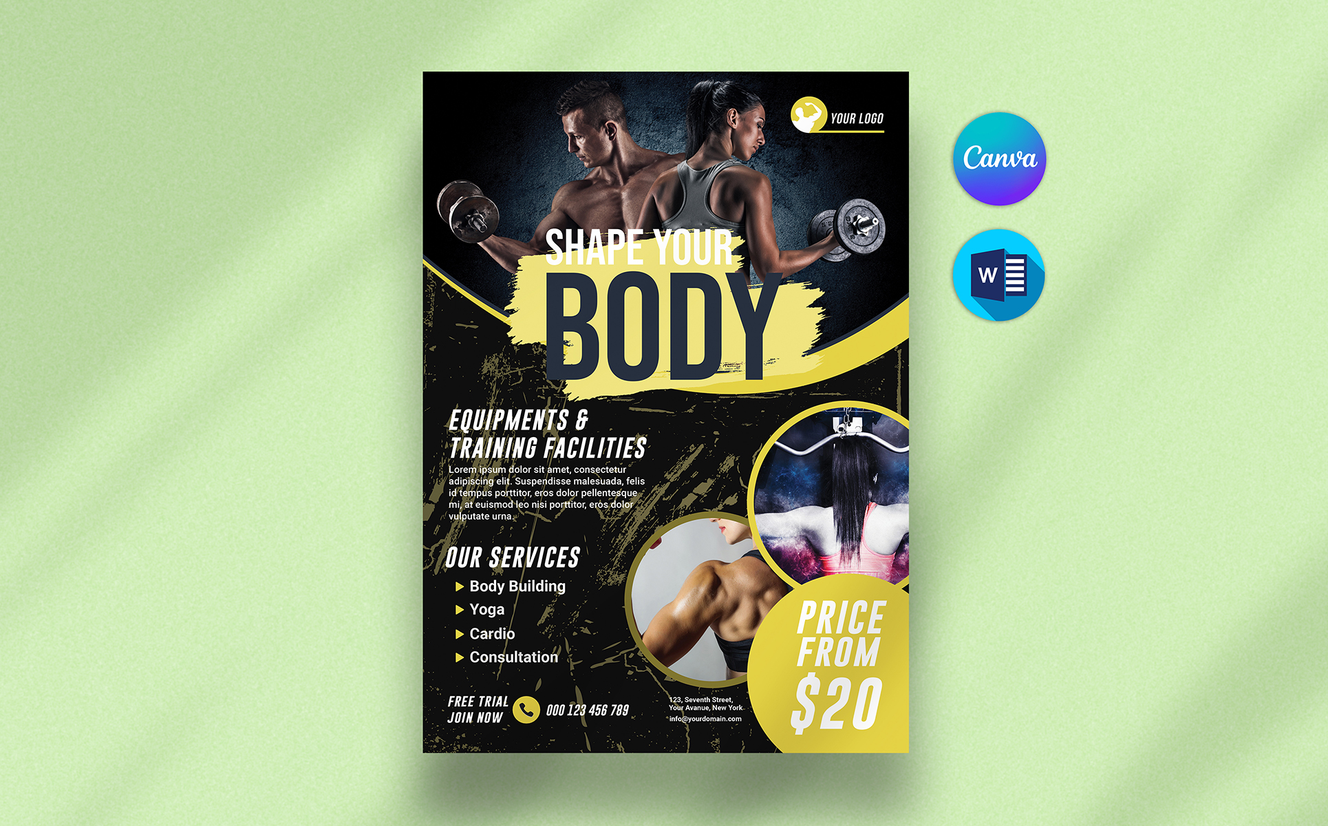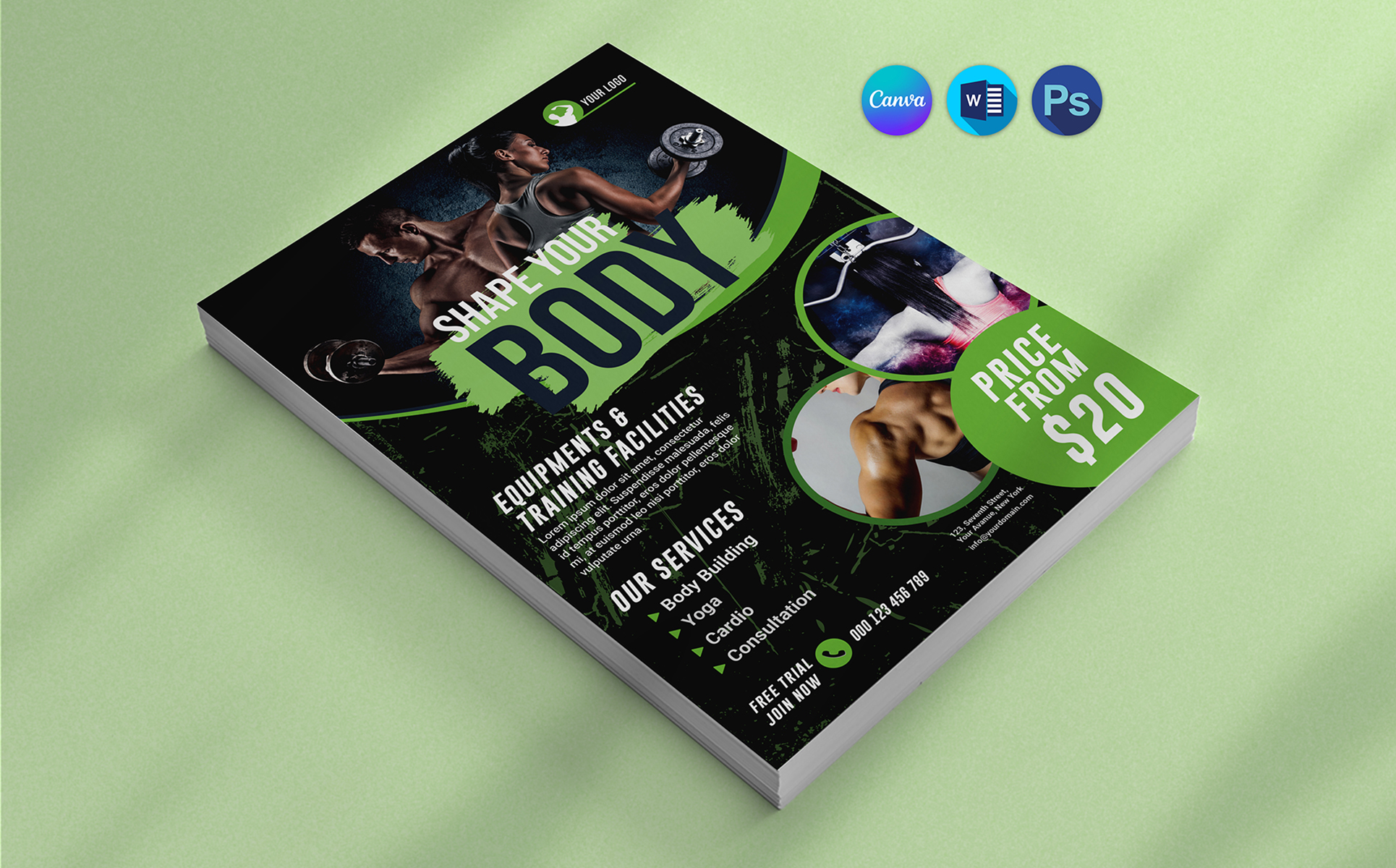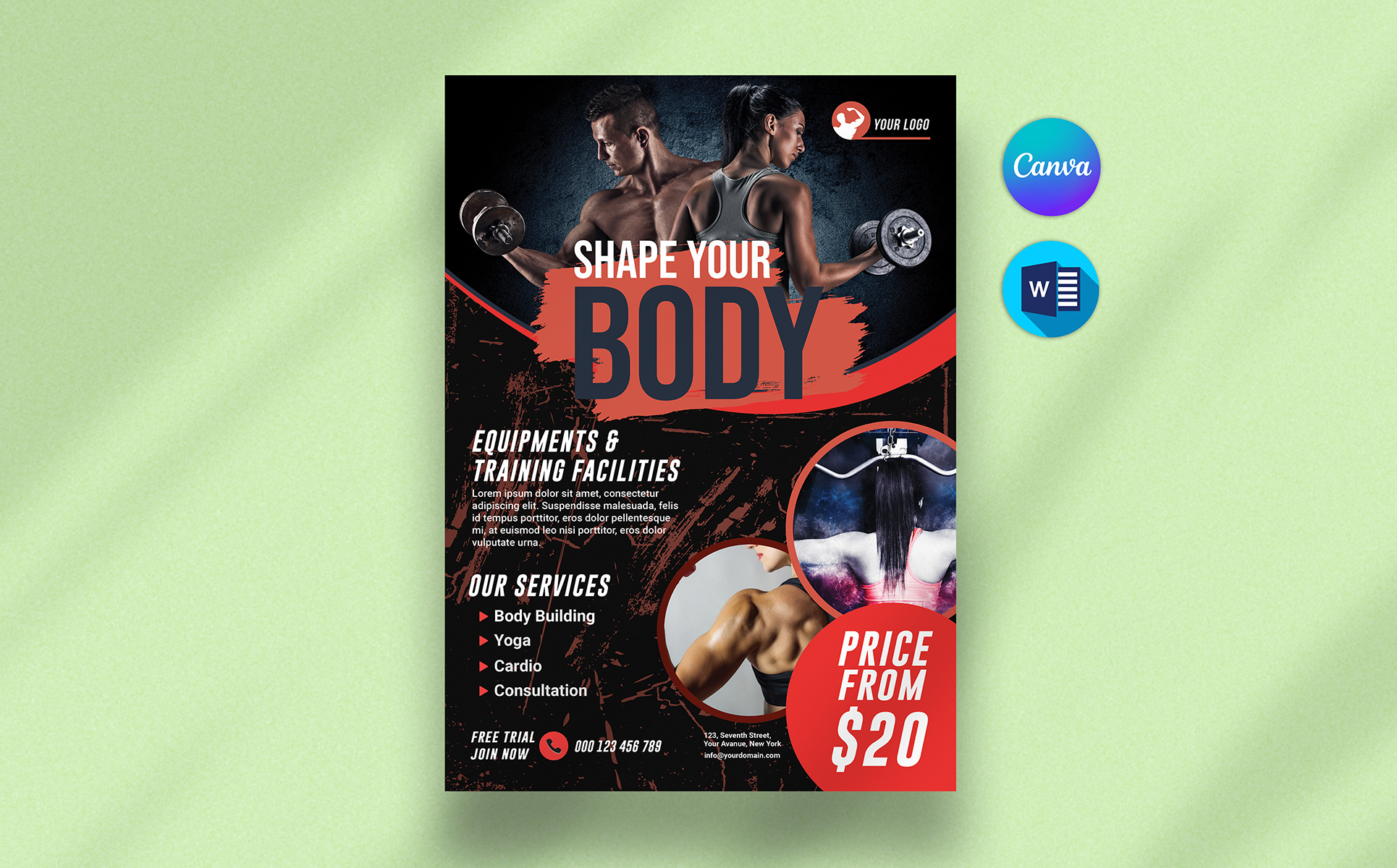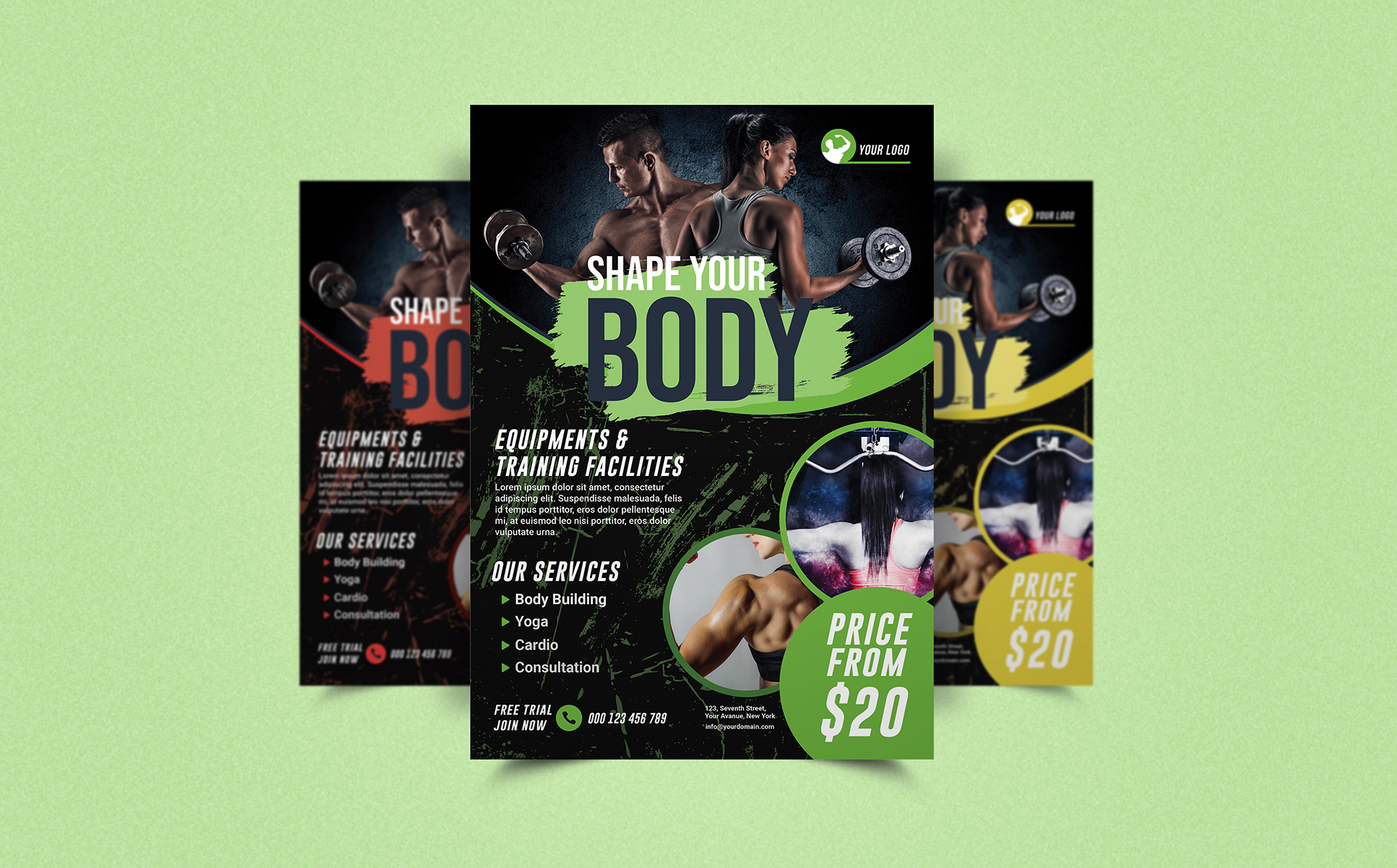Highly versatile fitness flyer suitable for all health or sports-related business. Create a stunning leaflet on the fly and streamline your workflow with this easy-to-edit template. Use it to create traditional print advertising such as magazine adverts, newspaper ads placement, promotional posters and all other ways you can think of. I would recommend this multipurpose flyer template for health, fitness, bodybuilding, gym, training, sports club, dance studio, martial arts, yoga, boxing and all other related businesses.