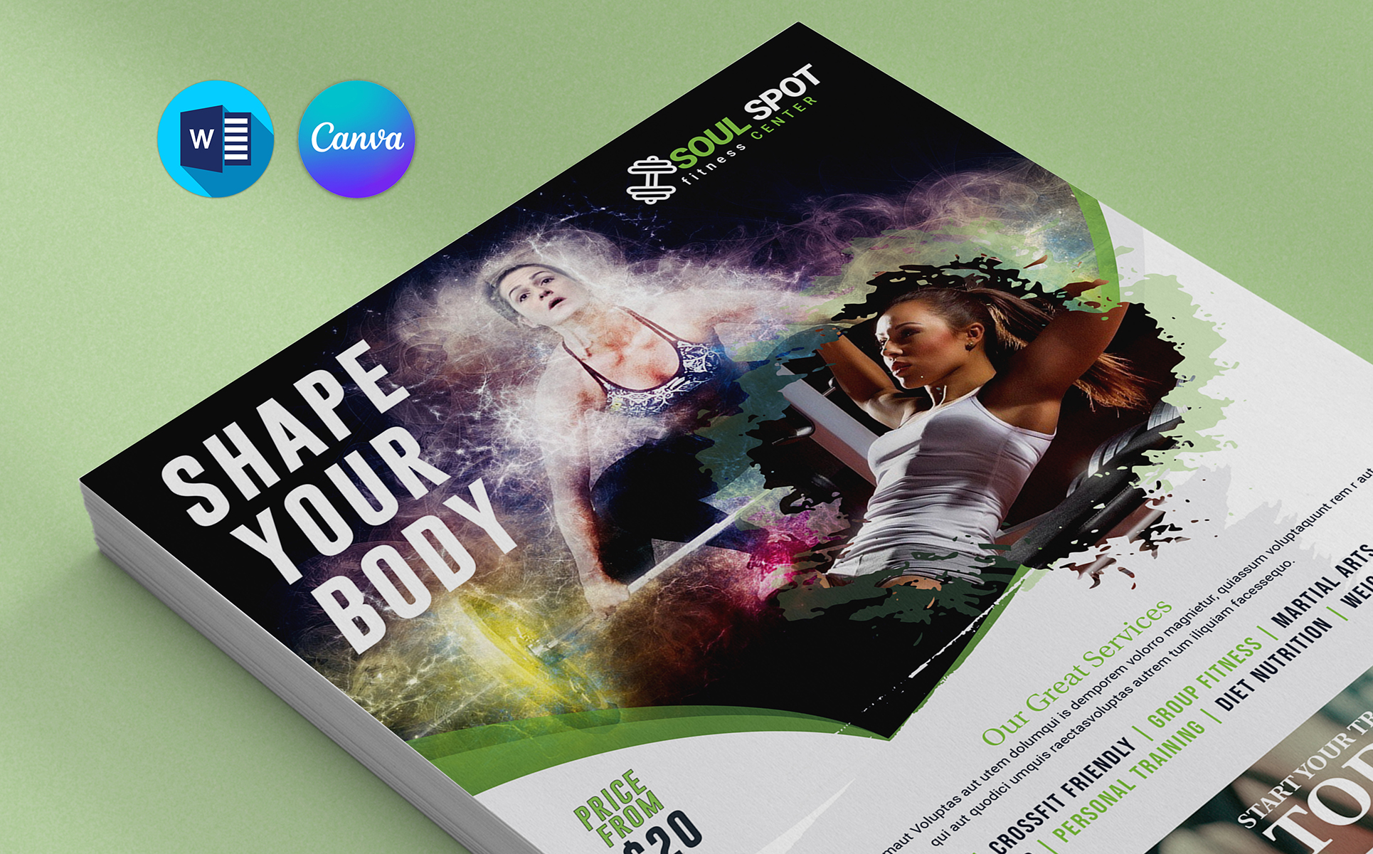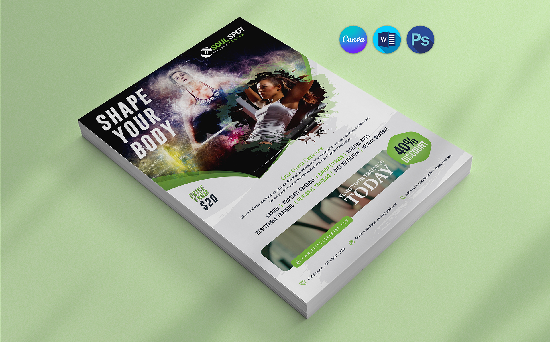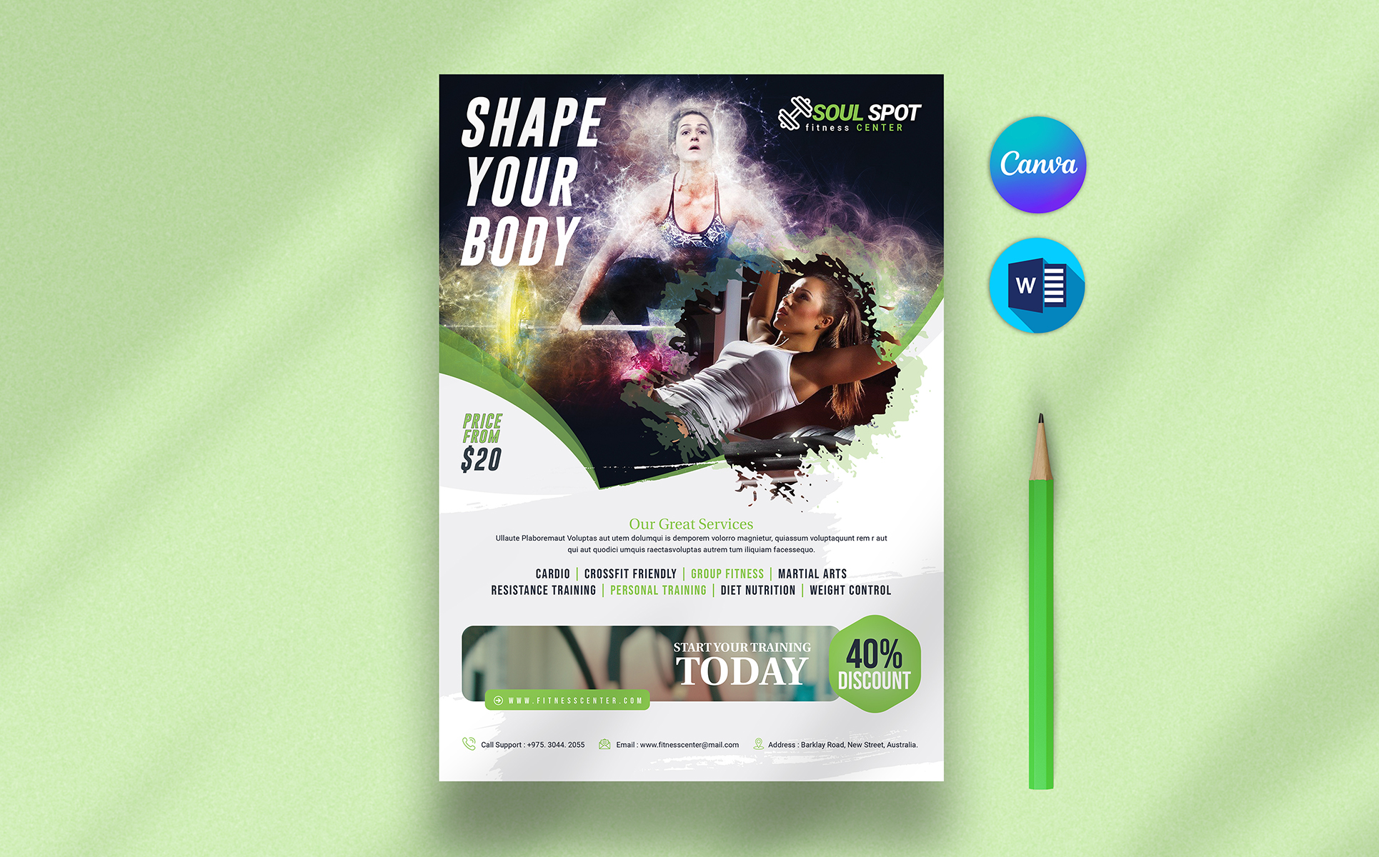 Highly versatile fitness flyer suitable for all health or sports-related business. Create a stunning leaflet on the fly and streamline your workflow with this easy-to-edit template. Use it to create traditional print advertising such as magazine adverts, newspaper ads placement, promotional posters and all other ways you can think of. I would recommend this multipurpose flyer template for health, fitness, bodybuilding, gym, training, sports club, dance studio, martial arts, yoga, boxing and all other related businesses.