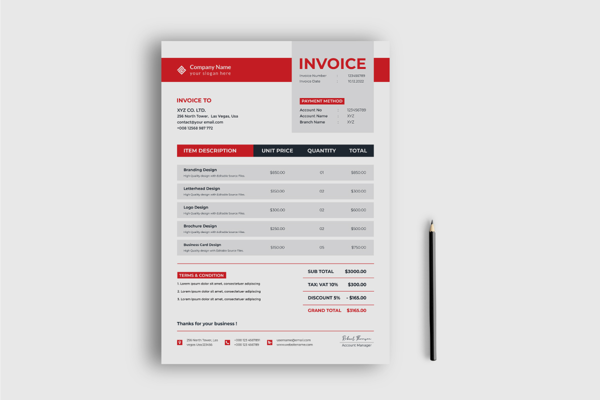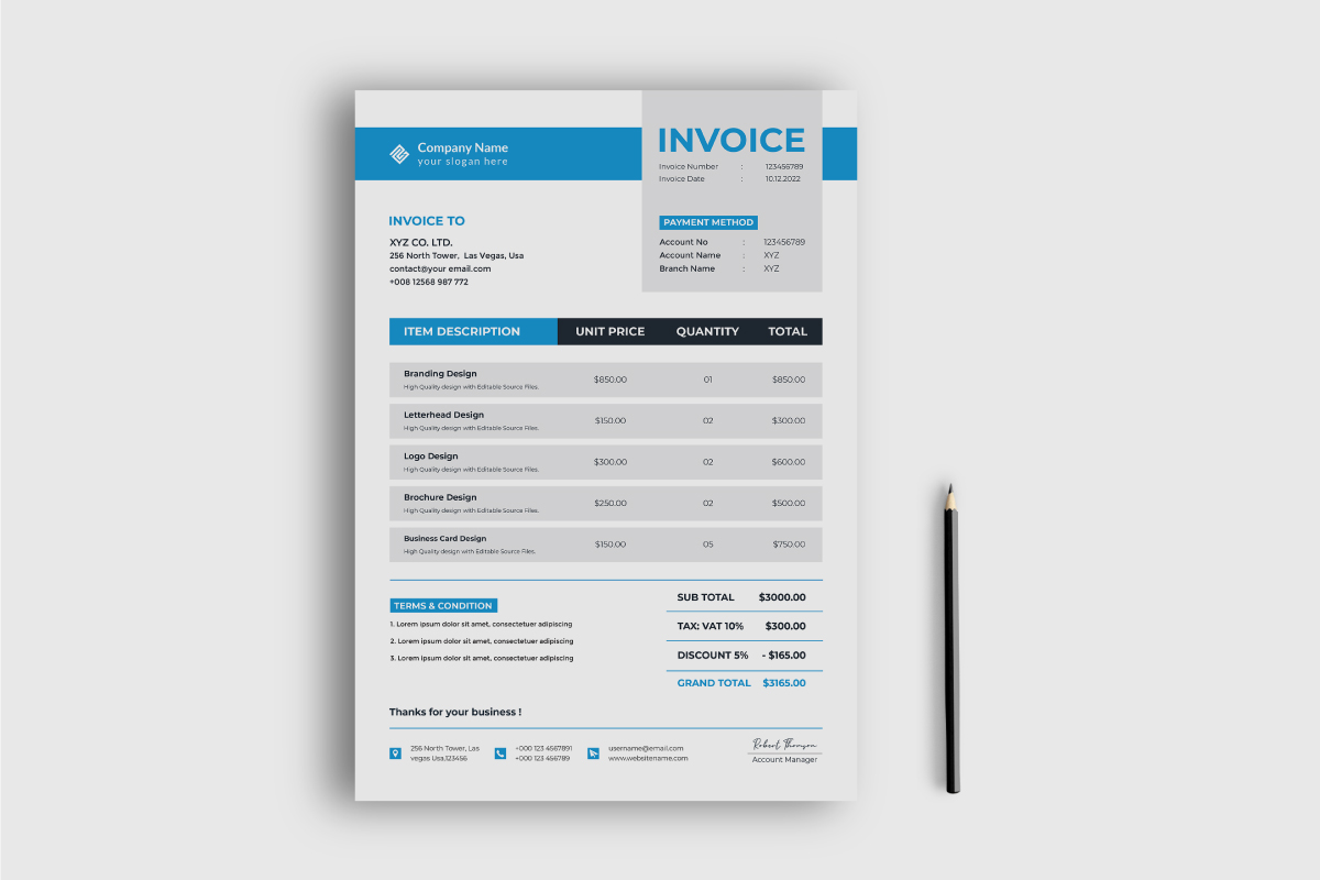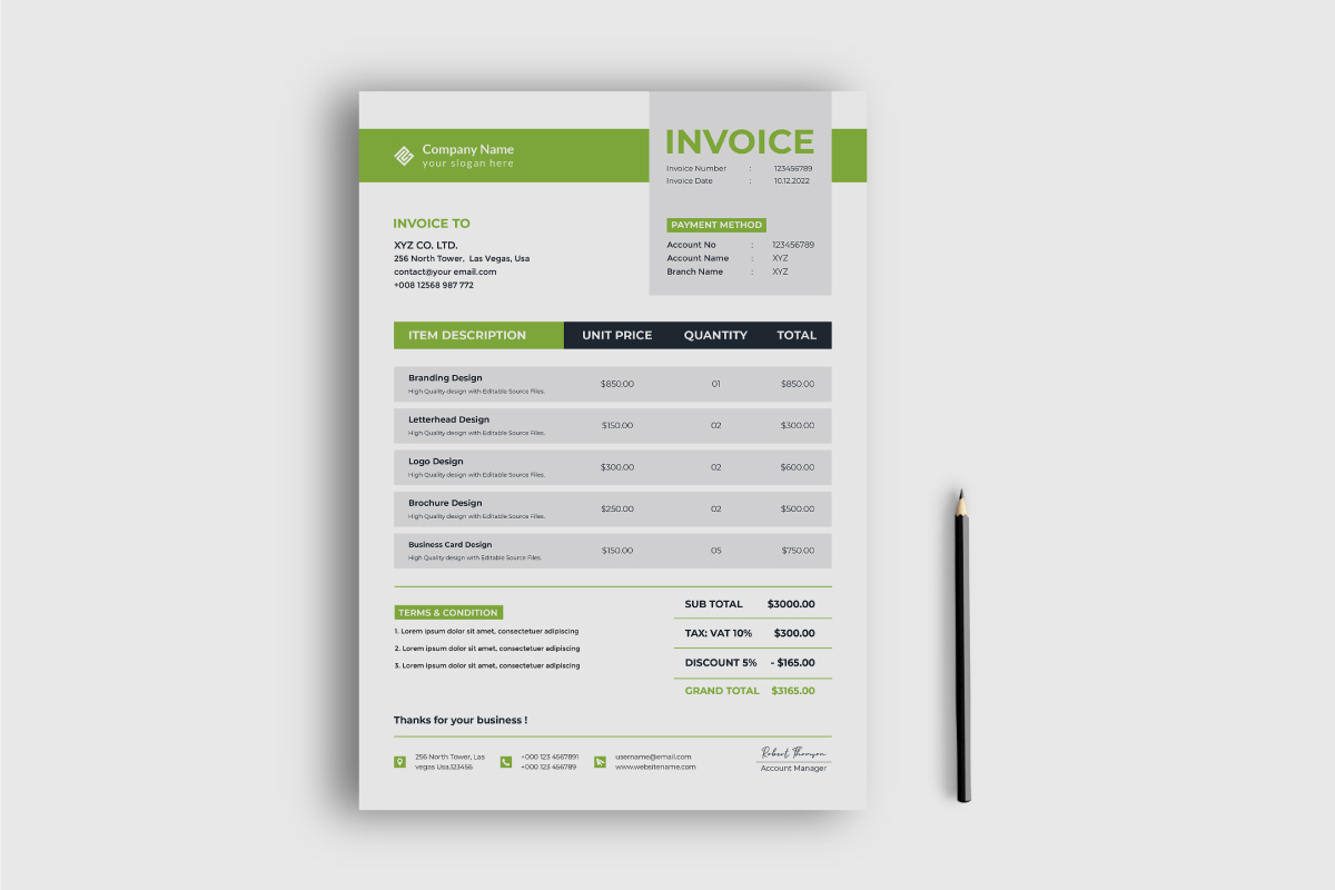 Clean Business Invoice Design Template. It’s made with Adobe Illustrator and easily editable text, logo, color, image, and all layers are properly organized.