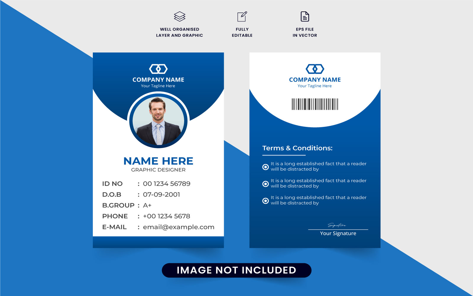 Company identification card template. Company identity card template design with dark blue color and geometric shapes. Organization ID card vector with photo placeholders. Modern business employee identification card design.