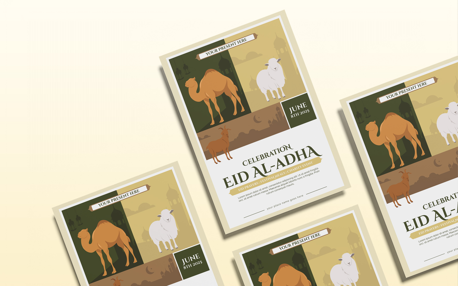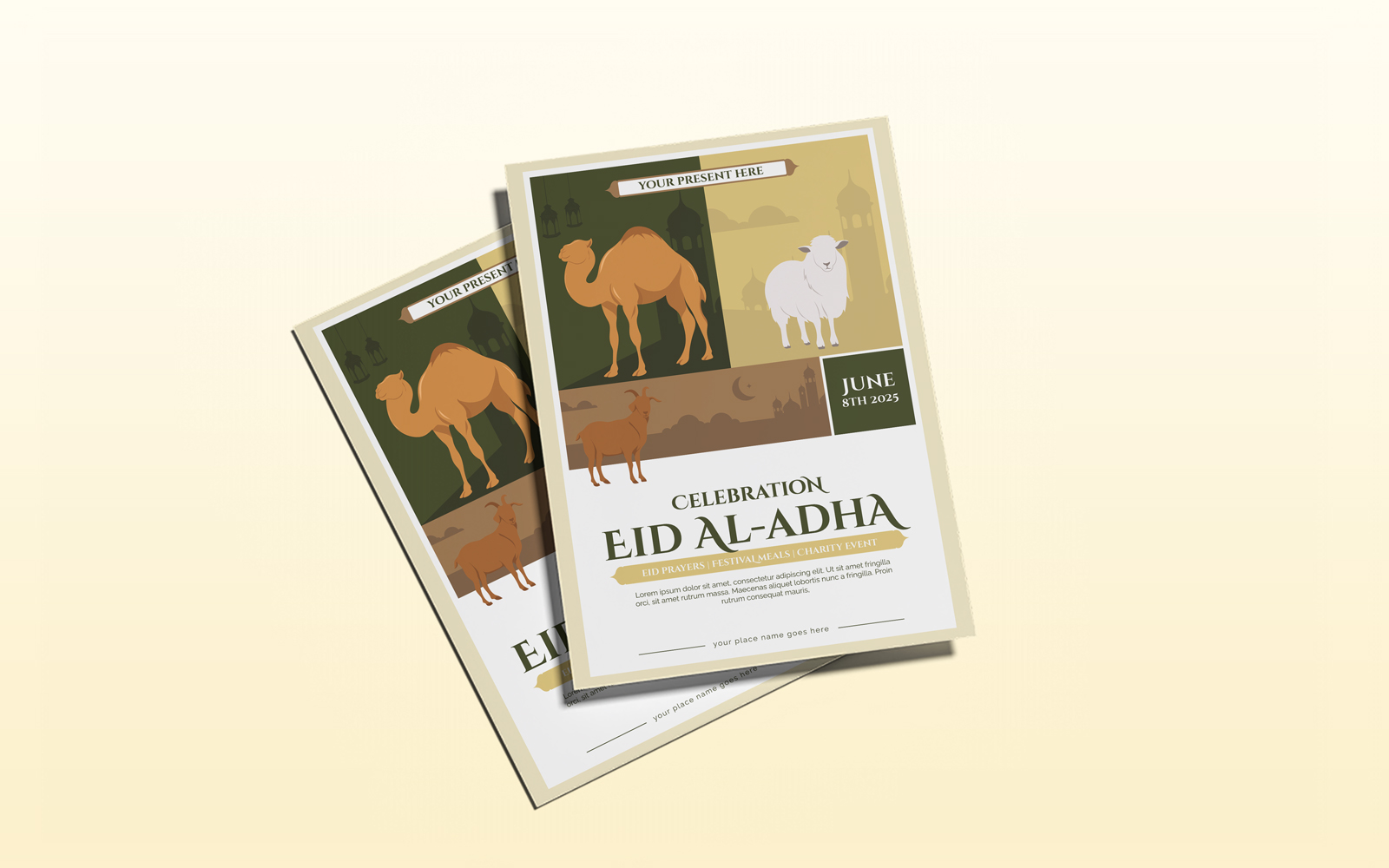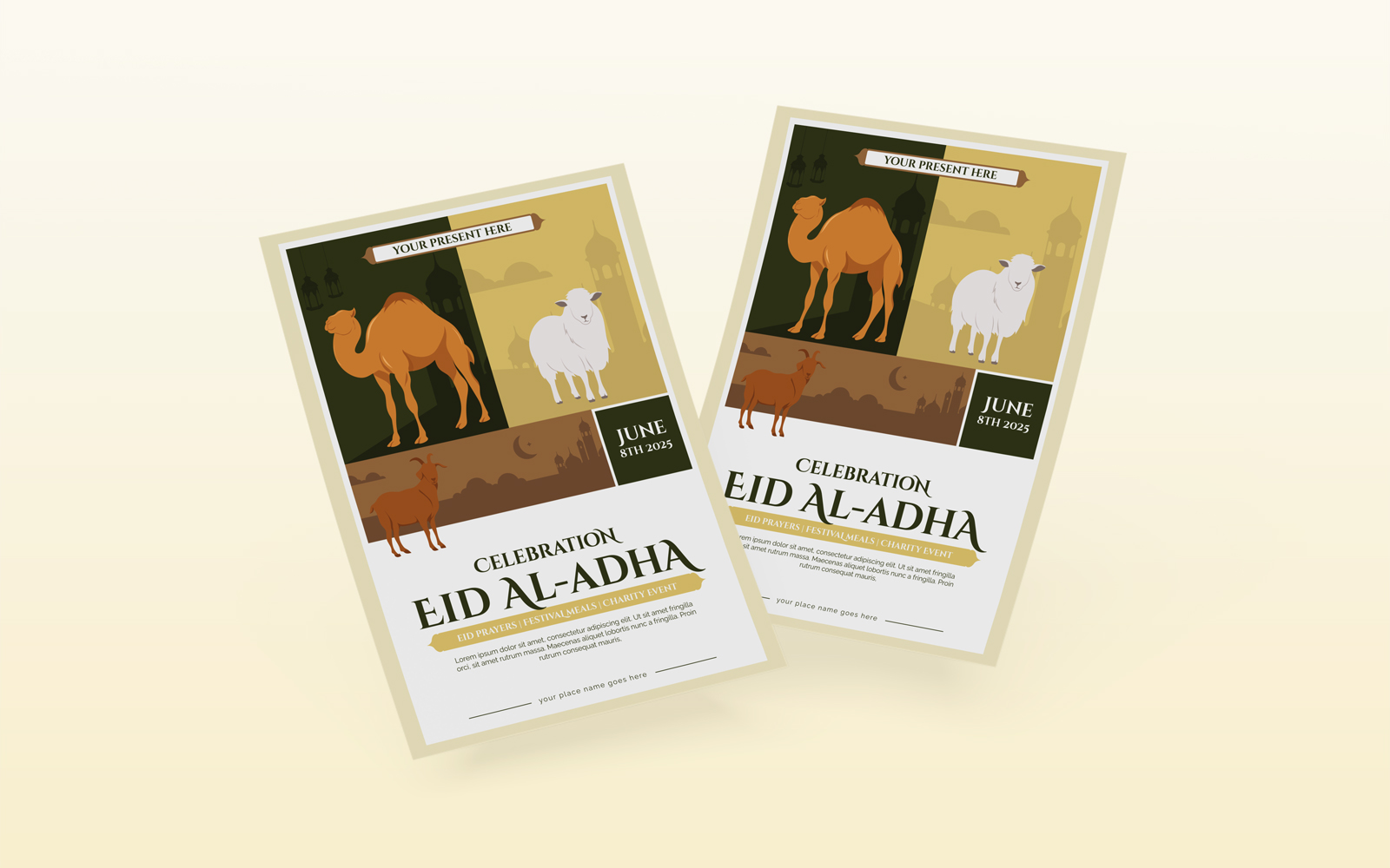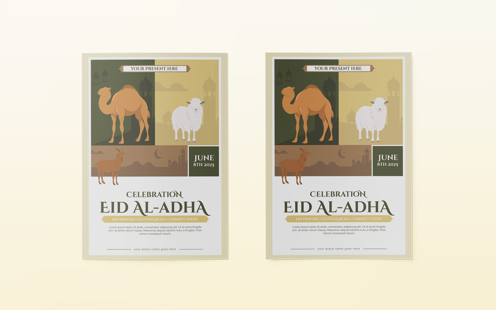 This contemporary flat-style Eid al-Adha poster features symbolic illustrations of a camel, sheep, and goat—representing the values of sacrifice and devotion in Islam. The layout is clean and modern, with an earth-tone color palette and Islamic skyline silhouettes that evoke a calm spiritual atmosphere. Designed for promoting Eid celebrations including prayers, festive meals, and charity events, this template is perfect for mosques, event organizers, schools, and community groups seeking a polished, culturally rich promotional visual for Eid al-Adha.