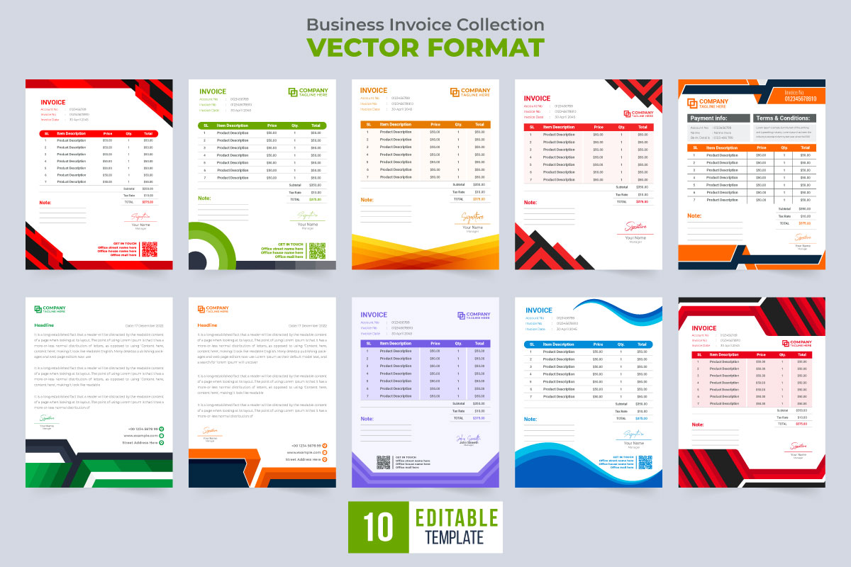 Corporate invoice and receipt template. Business invoice template collection for company brand promotion. Corporate identity invoice and purchase receipt bundle designed with creative shapes. Product price receipt stationery set design.
