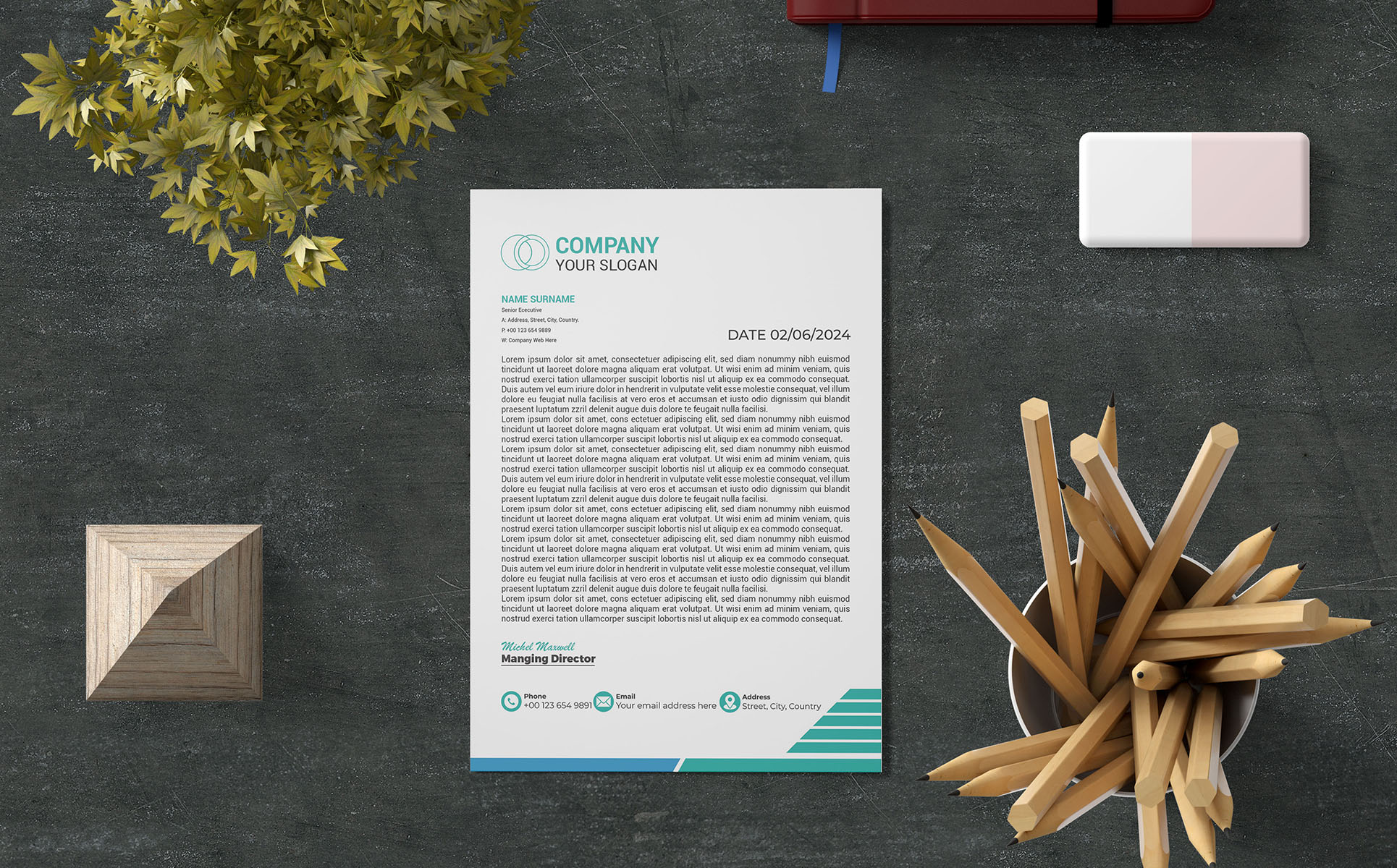 This is a Letterhead Design. This template download contains 300 dpi print-ready CMYK PSD, AI & EPS files.