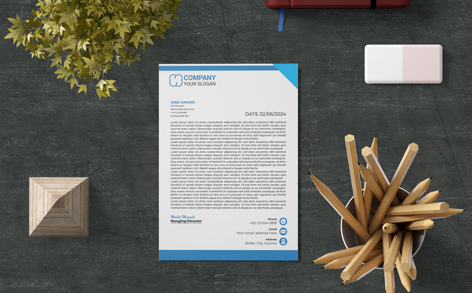 This is a Letterhead Design. This template download contains 300 dpi print-ready CMYK PSD, AI & EPS files.