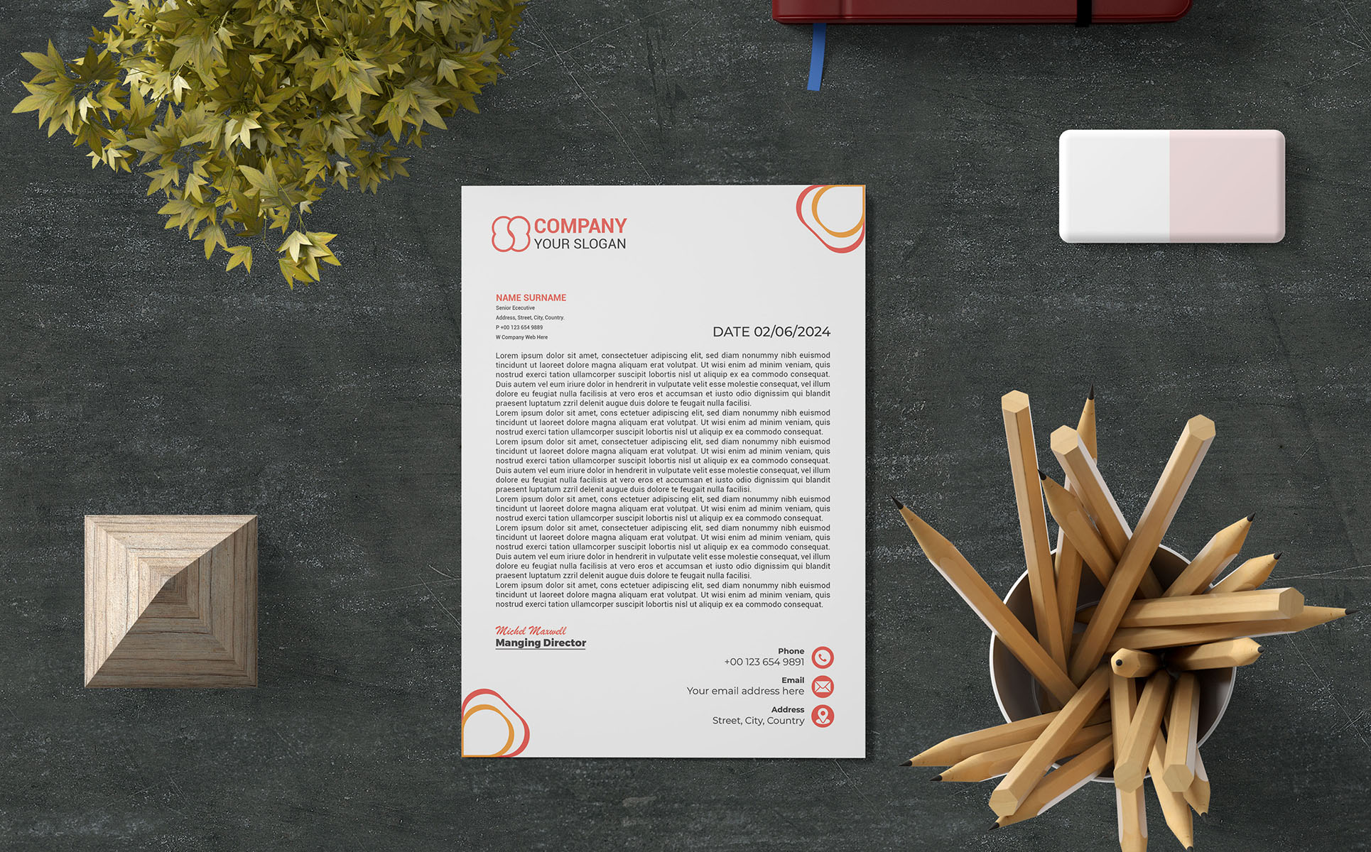 This is a Letterhead Design. This template download contains 300 dpi print-ready CMYK PSD, AI & EPS files.