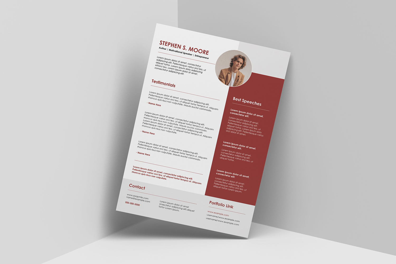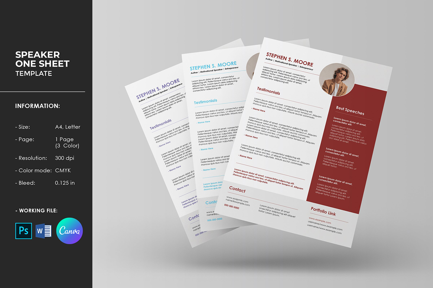 Create a standout speaker profile with this customizable one sheet template. Perfect for showcasing your bio, topics, and testimonials to land more speaking gigs.