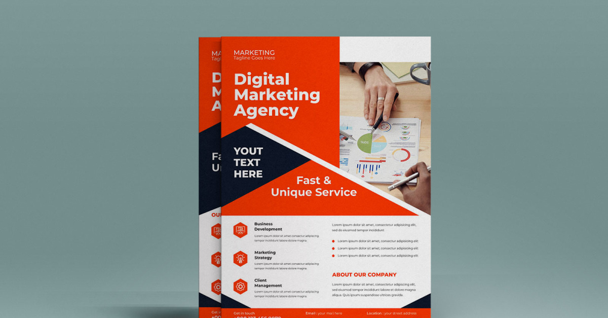 This is a Digital Marketing Agency Corporate Business Flyer Design. It is a Flyer Template that is suitable for promoting your Business. Most of the design is based on the shape, so you can scale it to any size. Easy to edit, then It is print-ready!