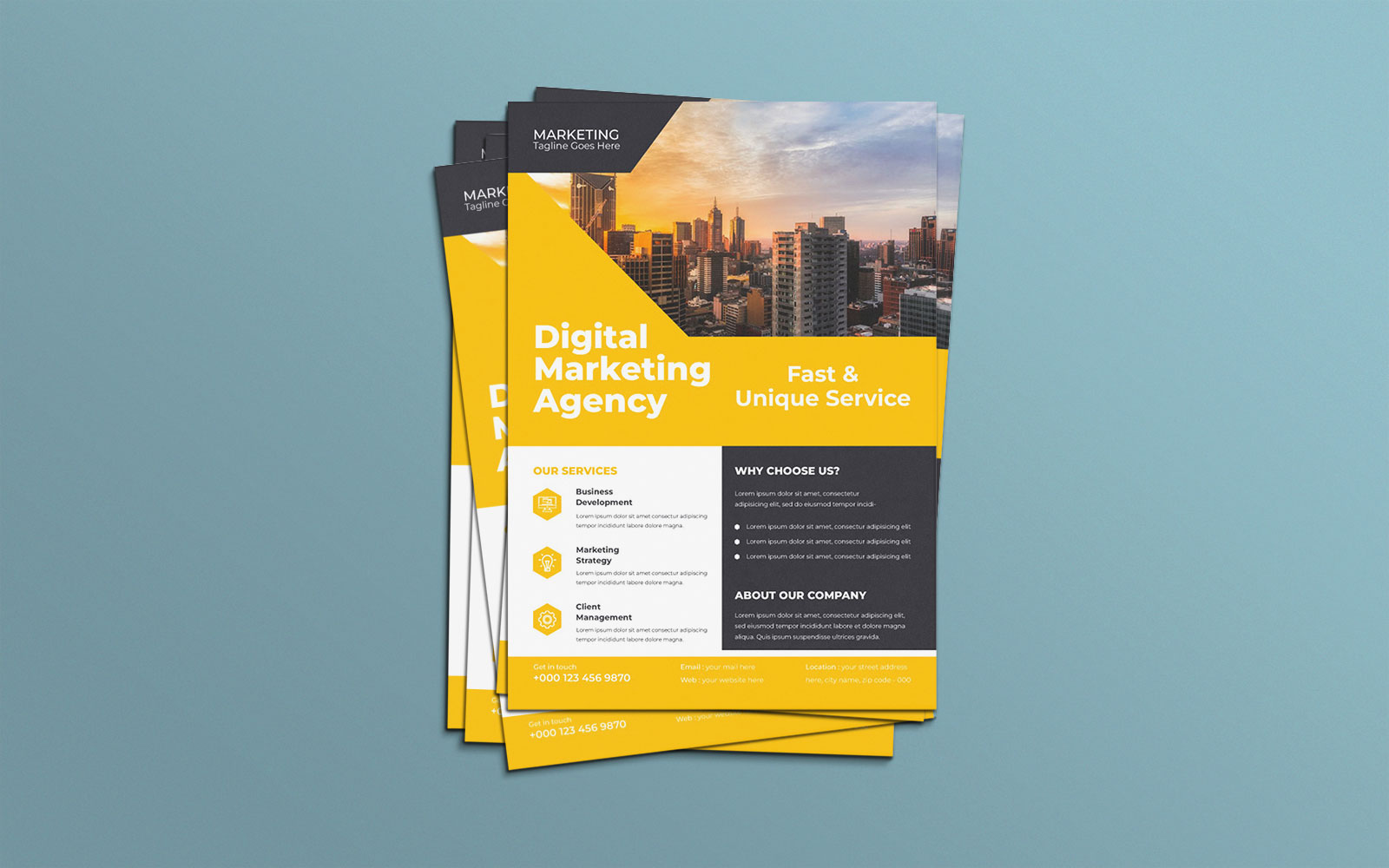 This is a Digital Marketing Agency Corporate Business Flyer Design. It is a Flyer Template that is suitable for promoting your Business. Most of the design is based on the shape, so you can scale it to any size. Easy to edit, then It is print-ready!