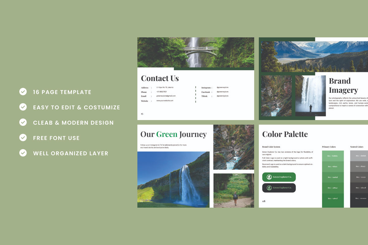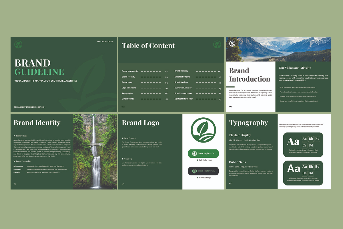 Inspire trust and connection with an eco-conscious brand guideline tailored for green agencies and sustainable travel projects. Featuring nature-inspired design, earthy color palettes, and a human-centered layout, this template empowers designers, art directors, and freelancers to create identities that feel authentic, fresh, and deeply connected to the environment. Perfect for building a consistent visual story that speaks to conscious audiences and modern travelers.