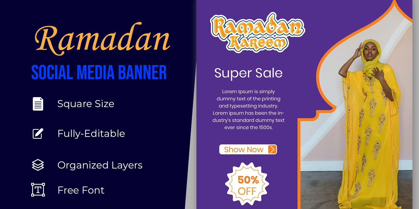 Ramadan sale social media post template banners ad, Eid Mubarak Sale with Flat 50% Off, Suitable for Greeting Card, Banner, Event Backdrop, Social Media, And Other Muslim Related Occasion.